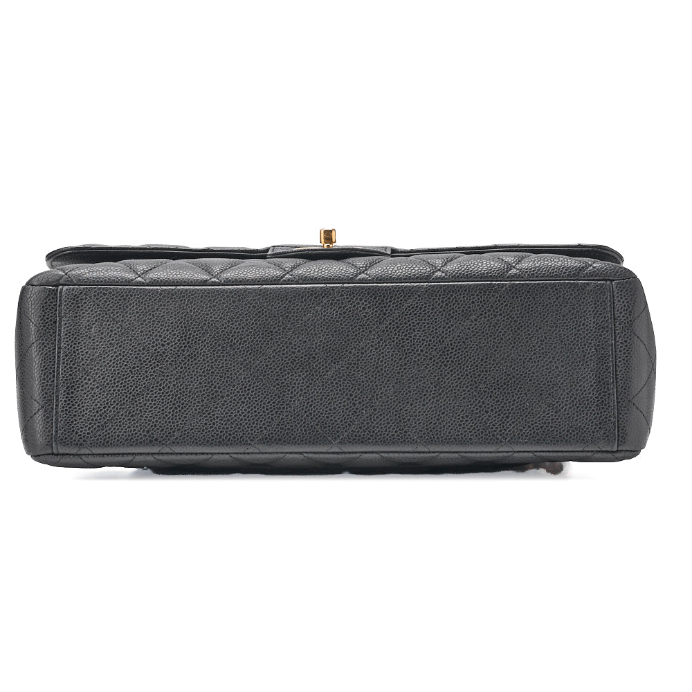 Gebrauchte Umhängetasche, Deca Matelassé, Doppelklappe, Kaviarhaut, Schwarz, Goldfarbene Metallteile, Gebraucht