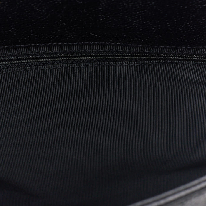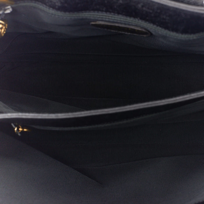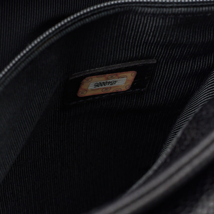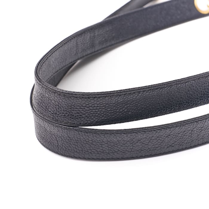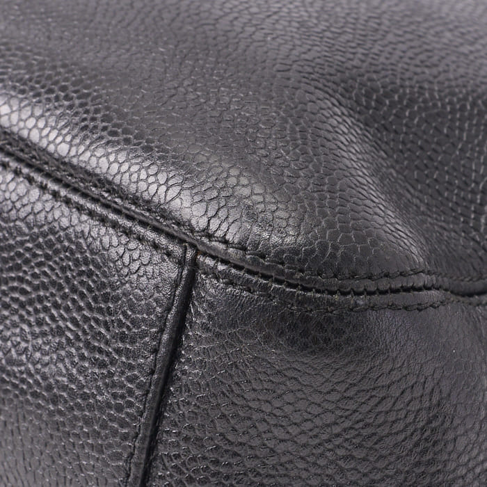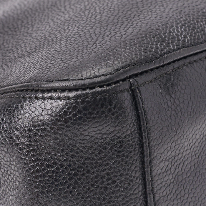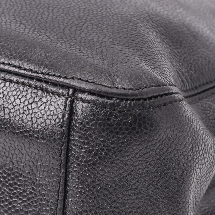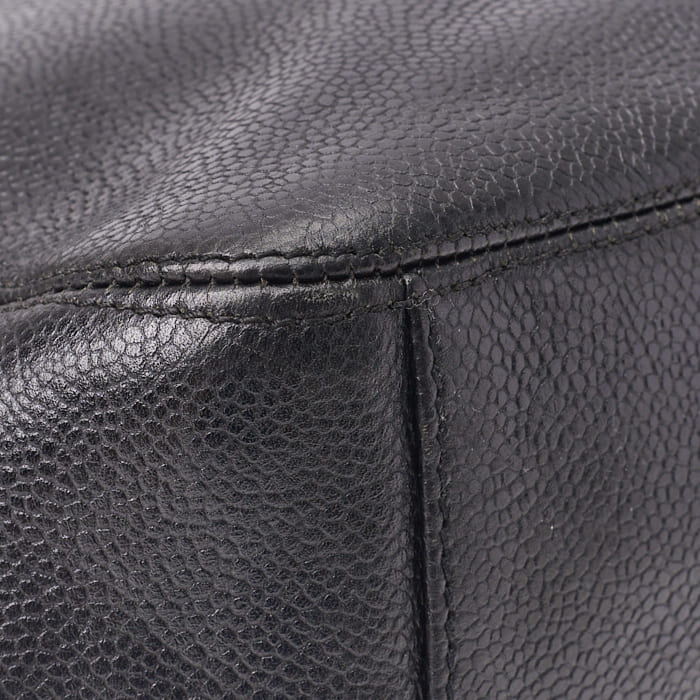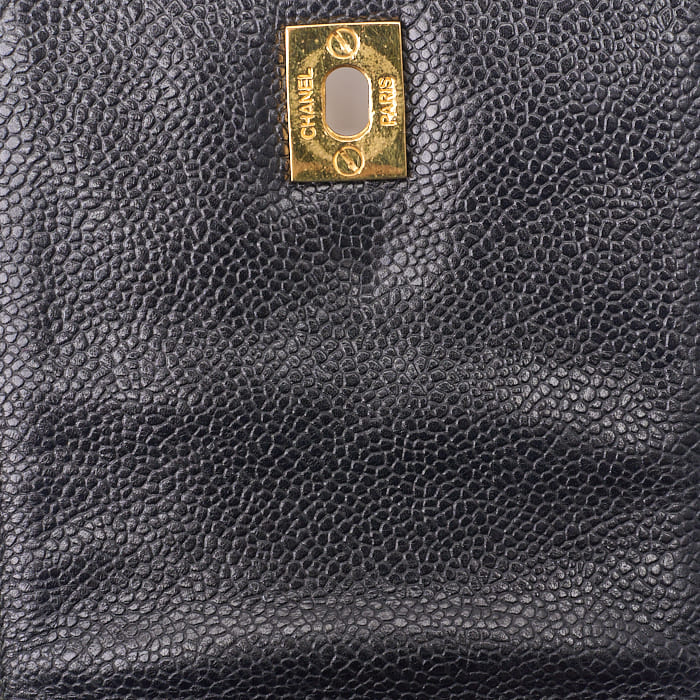 Gebrauchte Tragetasche, Drehverschluss, doppelte Schulterkette, Kaviarhaut, Schwarz, goldfarbene Metallteile, gebraucht