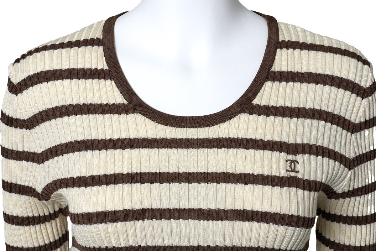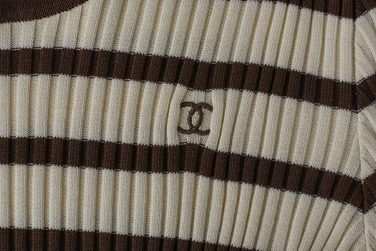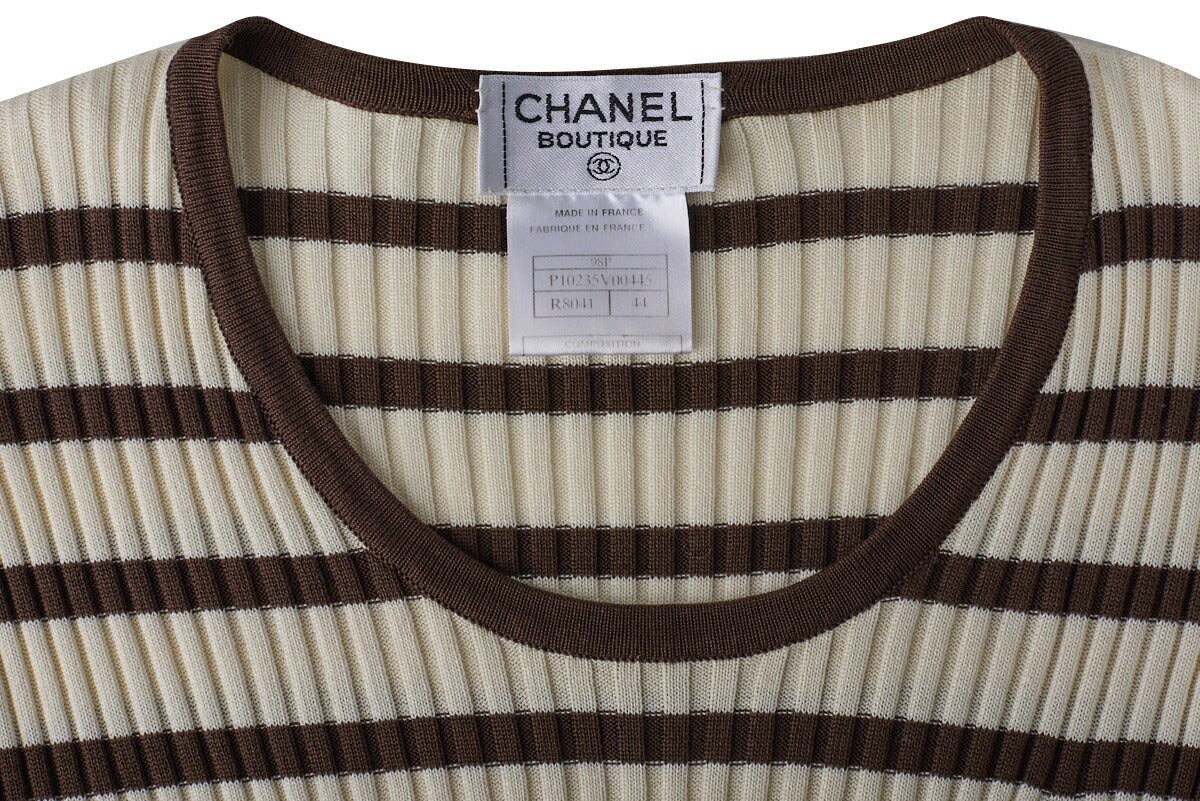 Werten Sie Ihre Garderobe mit dem atemberaubenden CHANEL Coco Mark Border Kurzarm-Strick-T-Shirt in einer wunderschönen Elfenbein- und Braun- Farbkombination auf. Dieses exquisite Stück in Größe 44 verkörpert die zeitlose Eleganz und Raffinesse, die für die Marke CHANEL steht.