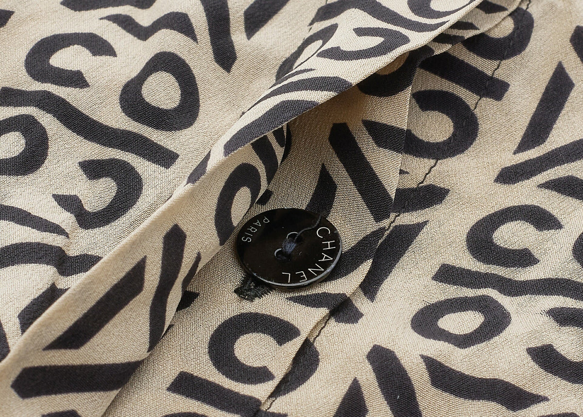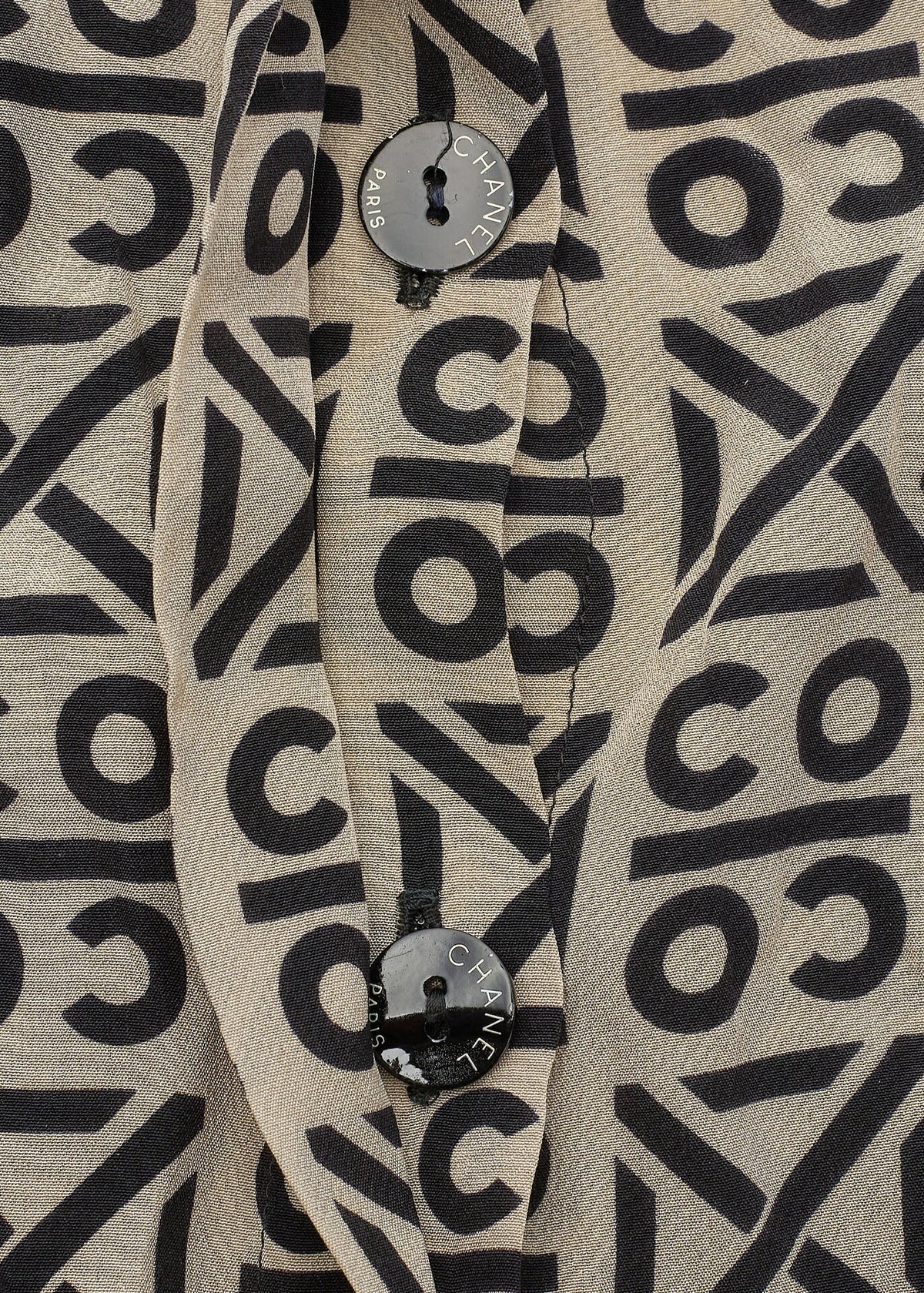 Gebrauchte Bluse, Coco Mark Logo-Knopf, Seide, Beige, goldfarbene Metallteile, gebraucht