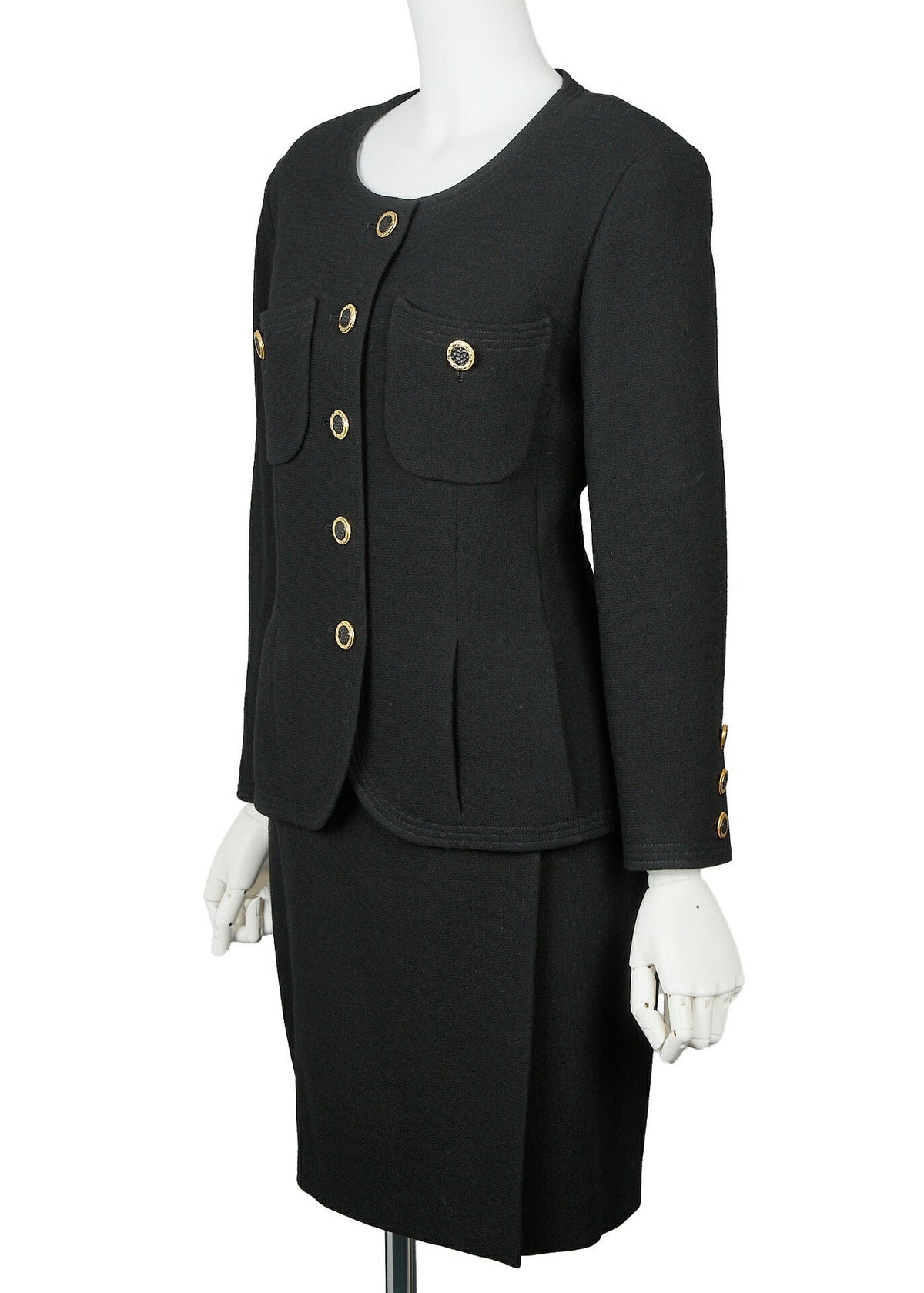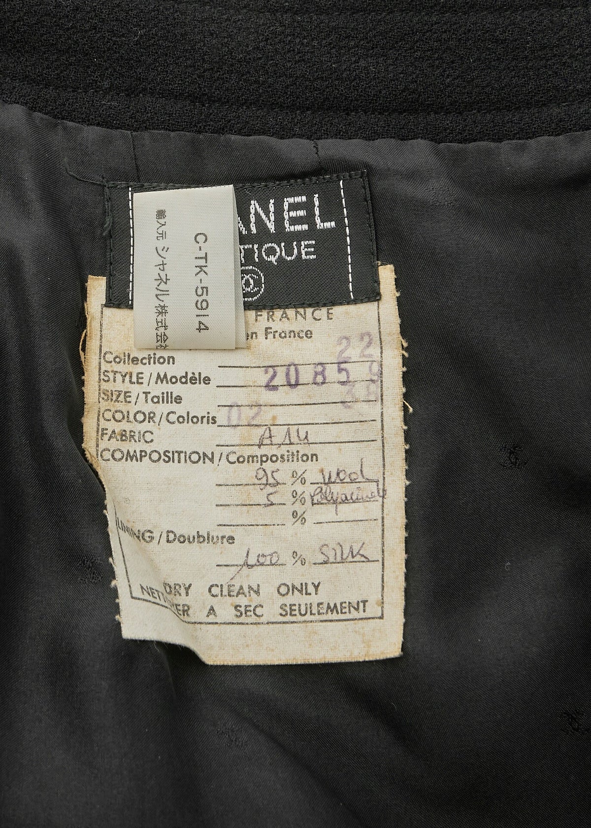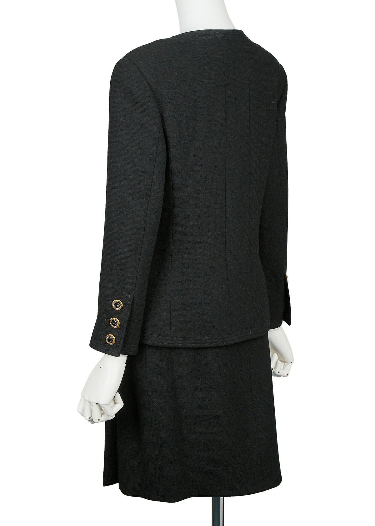 Werten Sie Ihre Garderobe mit dem CHANEL No Collar Jacket Skirt Set Up Outerwear Bottoms 38 Black auf , einem atemberaubenden Ensemble, das Eleganz und Raffinesse perfekt vereint. Gefertigt aus einer hochwertigen Mischung aus 95 % Wolle und 5 % Polyester bietet dieses schicke Set Komfort und Stil und ist damit ein unverzichtbares Accessoire für jede modebewusste Frau.