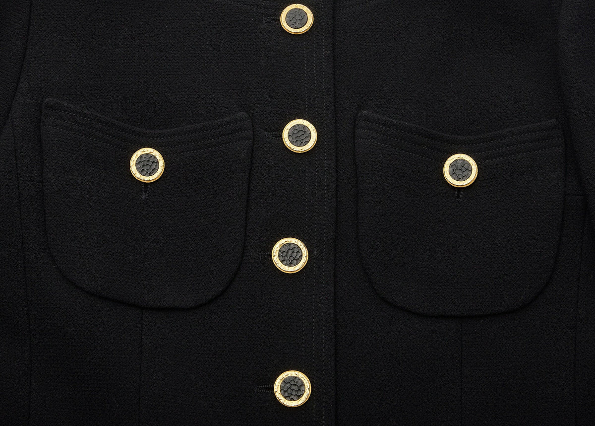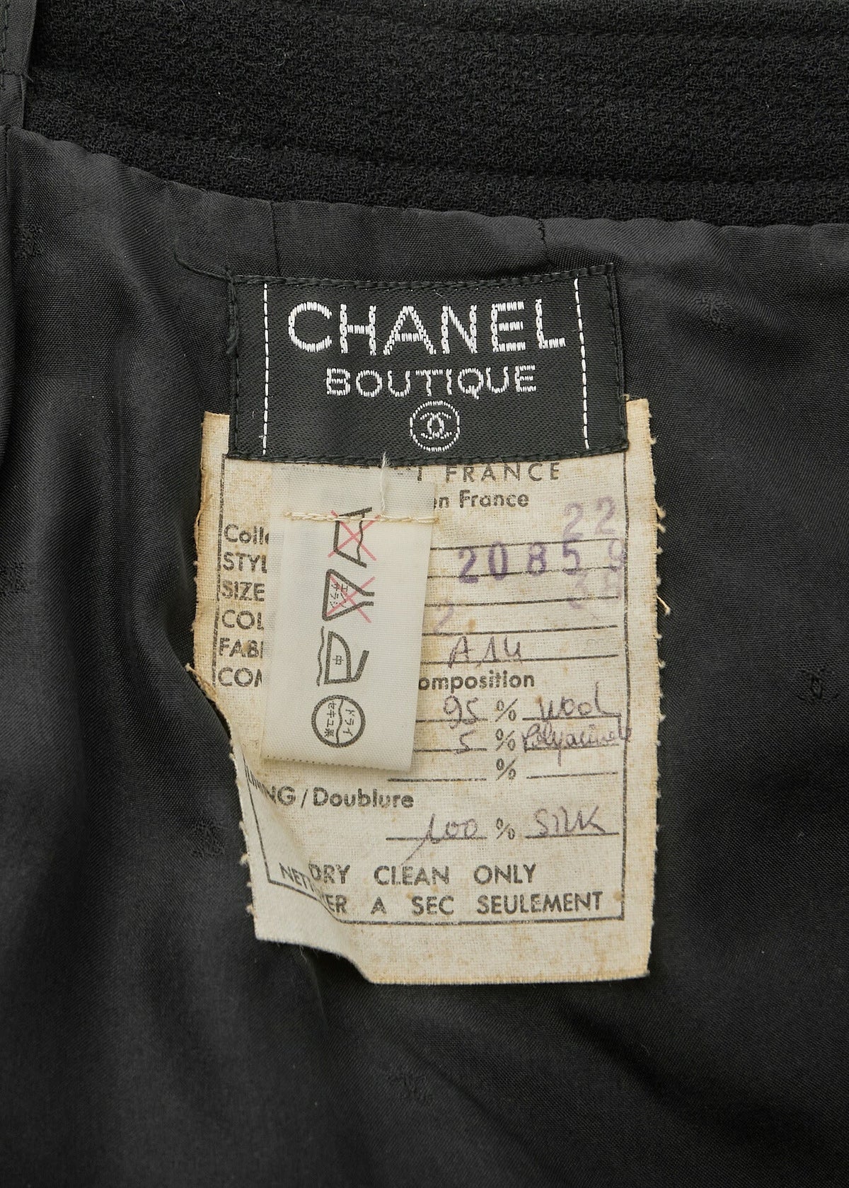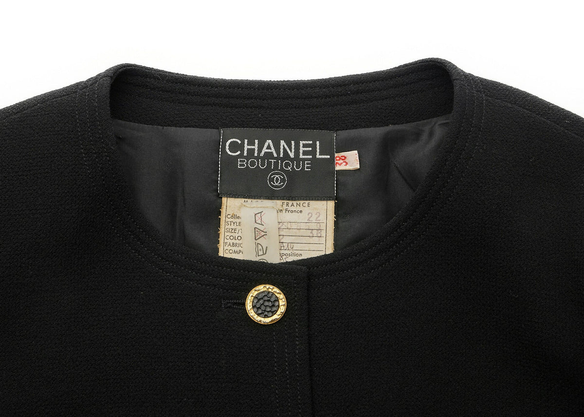 Werten Sie Ihre Garderobe mit dem CHANEL No Collar Jacket Skirt Set Up Outerwear Bottoms 38 Black auf , einem atemberaubenden Ensemble, das Eleganz und Raffinesse perfekt vereint. Gefertigt aus einer hochwertigen Mischung aus 95 % Wolle und 5 % Polyester bietet dieses schicke Set Komfort und Stil und ist damit ein unverzichtbares Accessoire für jede modebewusste Frau.