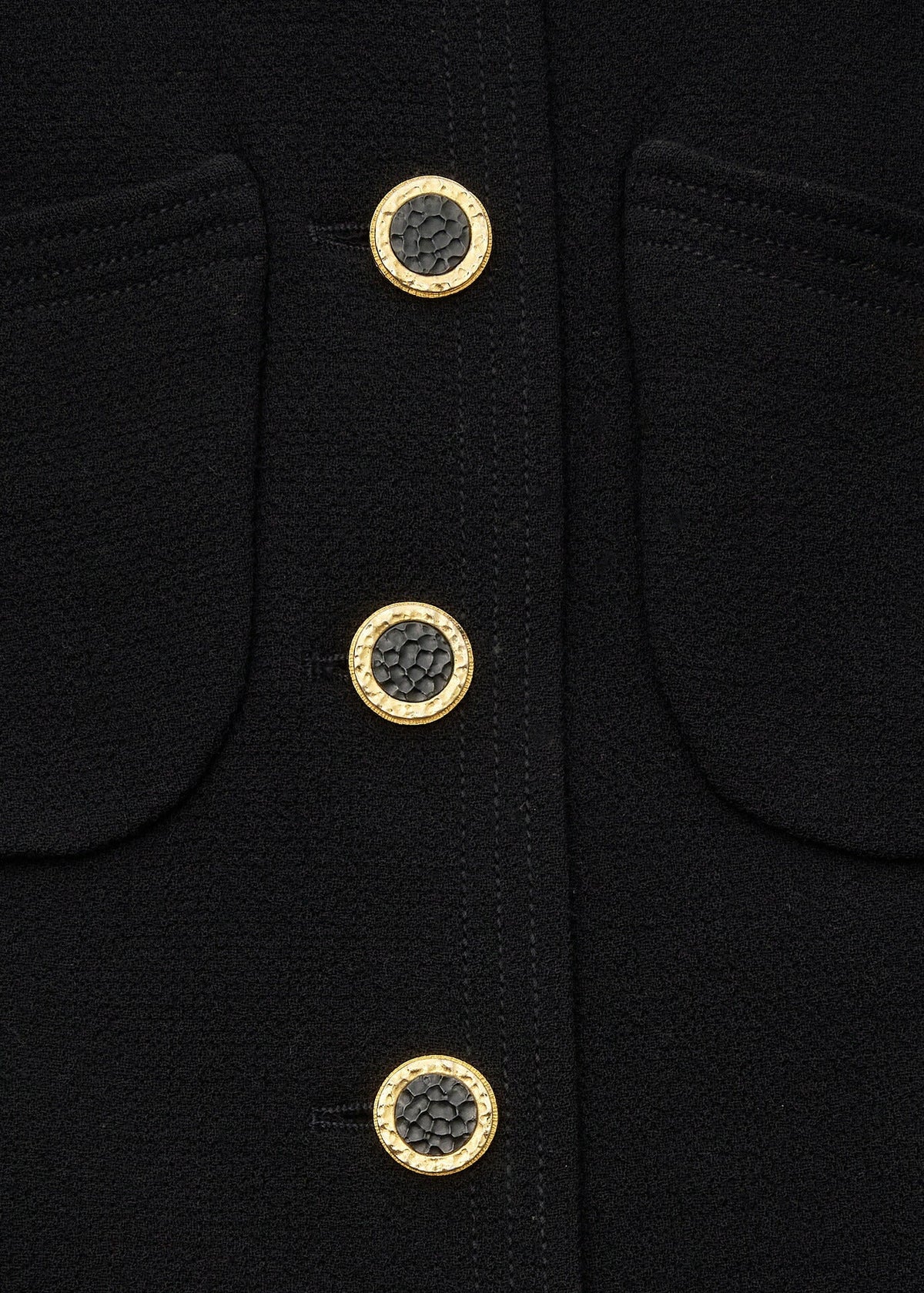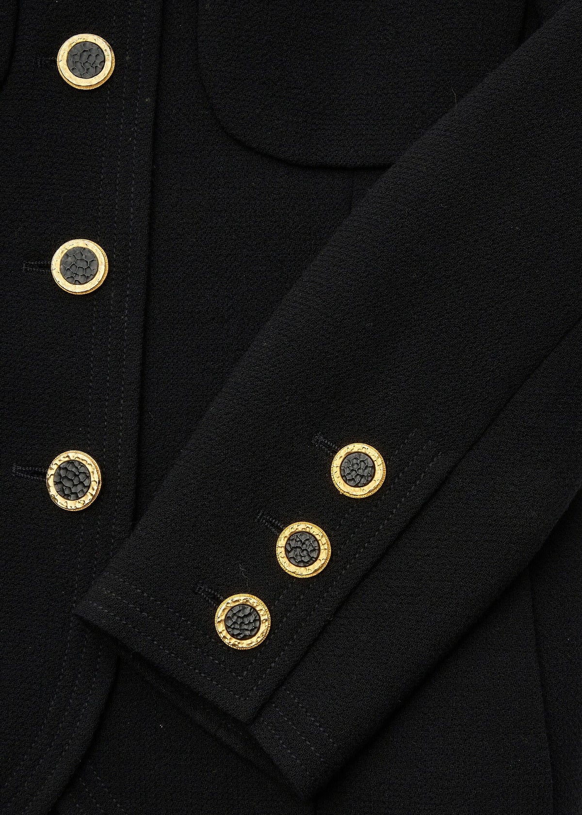Gebrauchtes Jacken-Rock-Set, ohne Kragen, Wollmischung, Schwarz, silberfarbene Metallteile, gebraucht