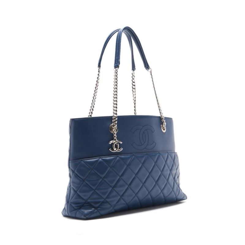 Gebrauchte Double Chain Tote Matelassé Lammleder Blau Silberfarbene Hardware Gebraucht