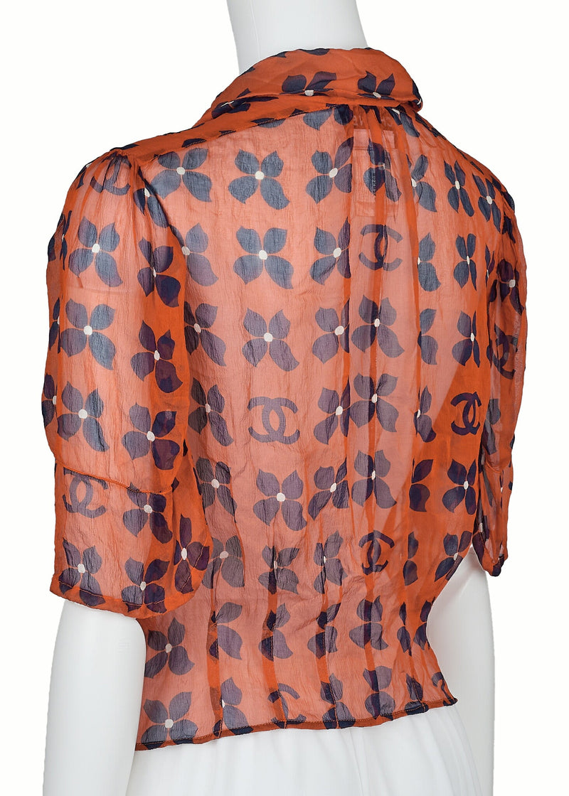 Gebrauchte Hemdbluse, Coco Mark Floral, Seide, Orange, goldfarbene Hardware, gebraucht
