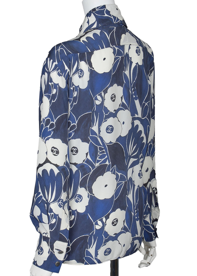 Pre-Owned Hemd Bluse Langarm Cut-and-Sew 100% Seide Blau Goldfarbene Hardware Pre-Owned