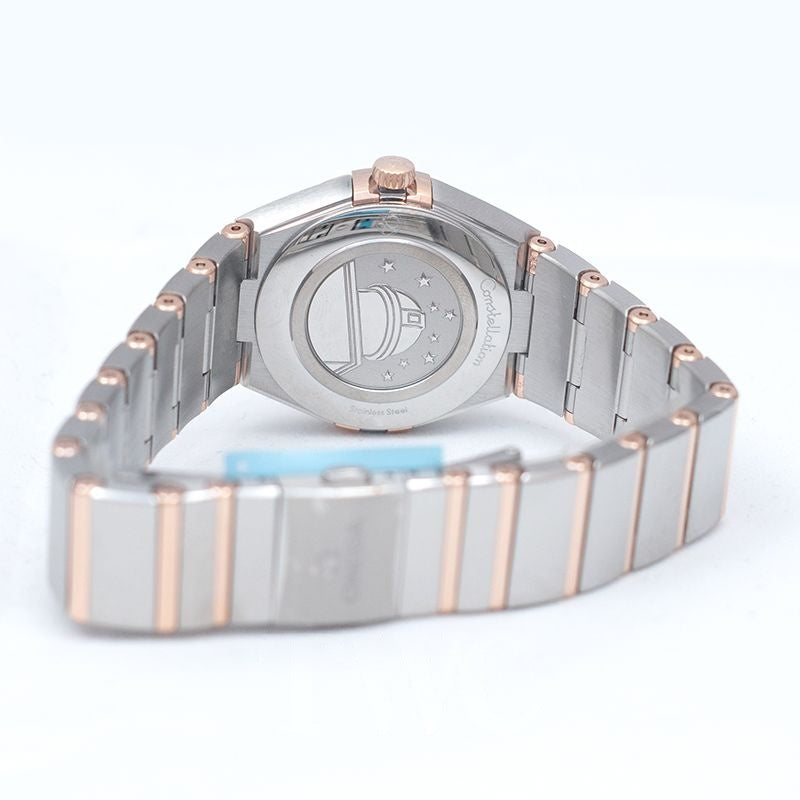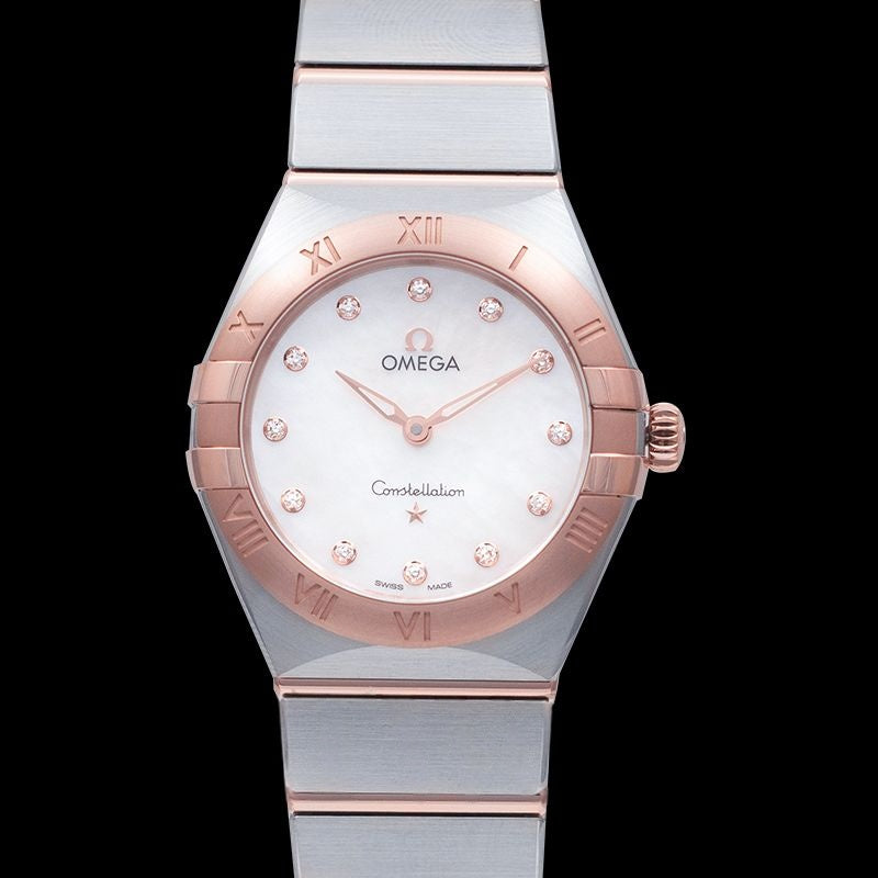 Diese 28-mm-Herrenuhr ist in 18 Karat Sedna-Gold und Edelstahl gefertigt und verfügt über eine Lünette mit den von Omega individuell gestalteten römischen Ziffern, ein weißes Perlmuttzifferblatt mit Diamant-Stundenmarkierungen und gewölbtes, kratzfestes und entspiegeltes Saphirglas. Das Omega-Logo, die Zeiger, der Constellation-Stern und die Diamantfassungen sind ebenfalls aus 18 Karat Sedna-Gold gefertigt. Wie die meisten anderen Modelle der Constellation-Kollektion, die für ihre berühmten halbmondförmigen „Krallen“ bekannt ist, bildet das Herzstück der Uhr das OMEGA Kaliber 4061. Das Zifferblatt ist weiß, und der Gehäuseboden ist, typisch für die Omega Constellation Manhattan 131.20.28.60.55.001, mit dem Constellation-Observatorium-Medaillon geprägt.