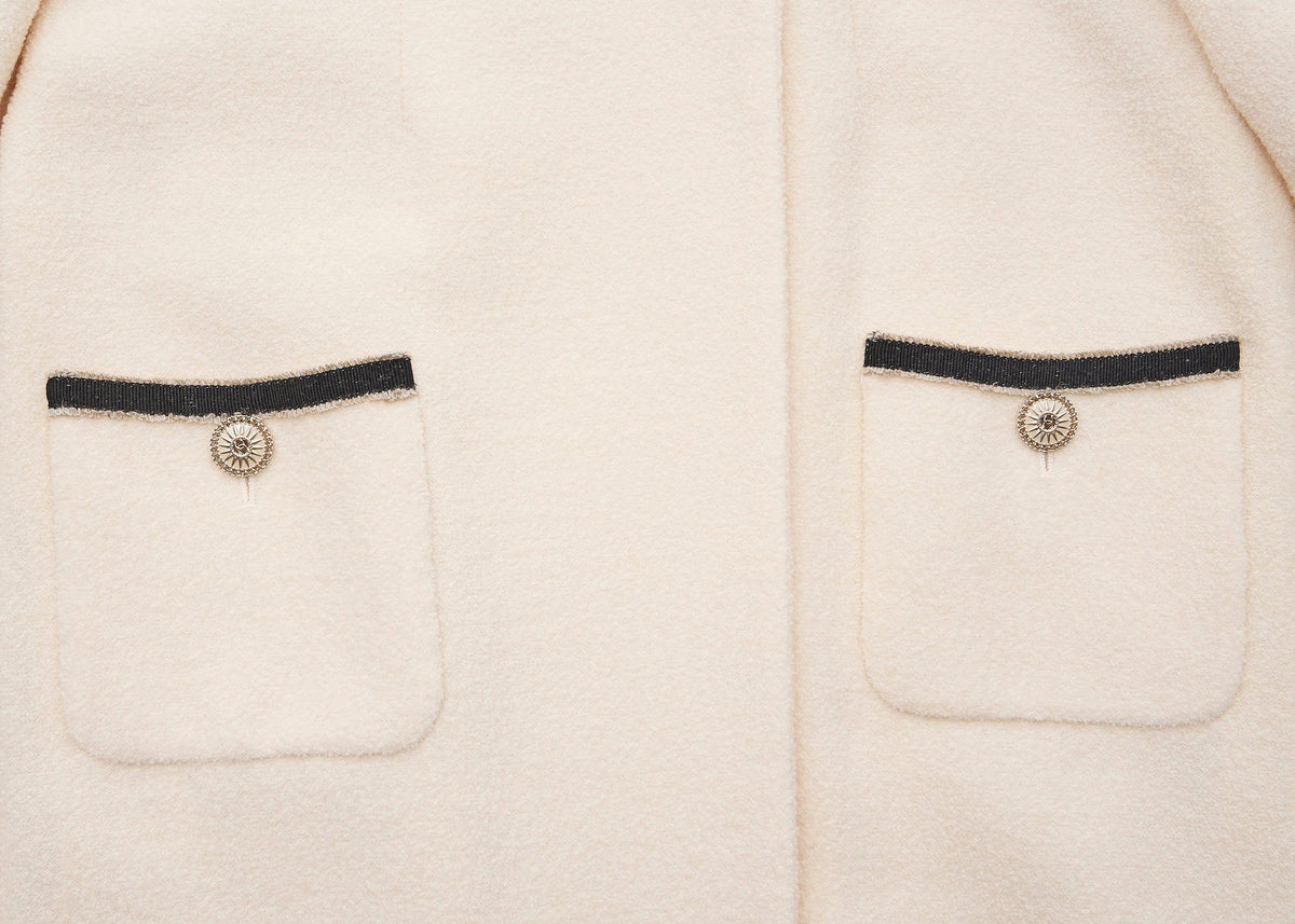 Gebrauchter Langer Mantel, Coco-Knopf, Woll-Nylon-Seidenmischung, Elfenbein, goldfarbene Metallteile, Gebraucht
