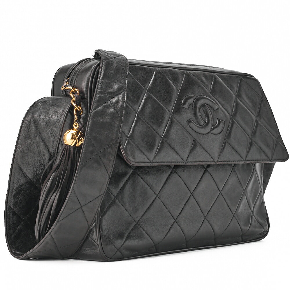 Sac à bandoulière Matlasse Coco Mark Fringe, grande taille, en cuir d'agneau noir, finitions dorées, d'occasion