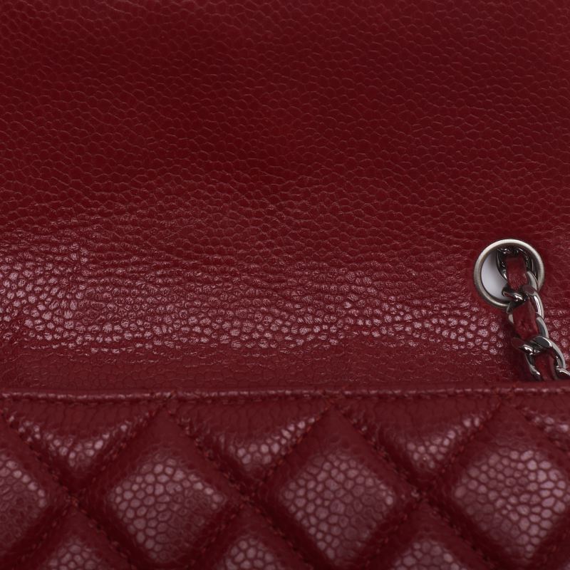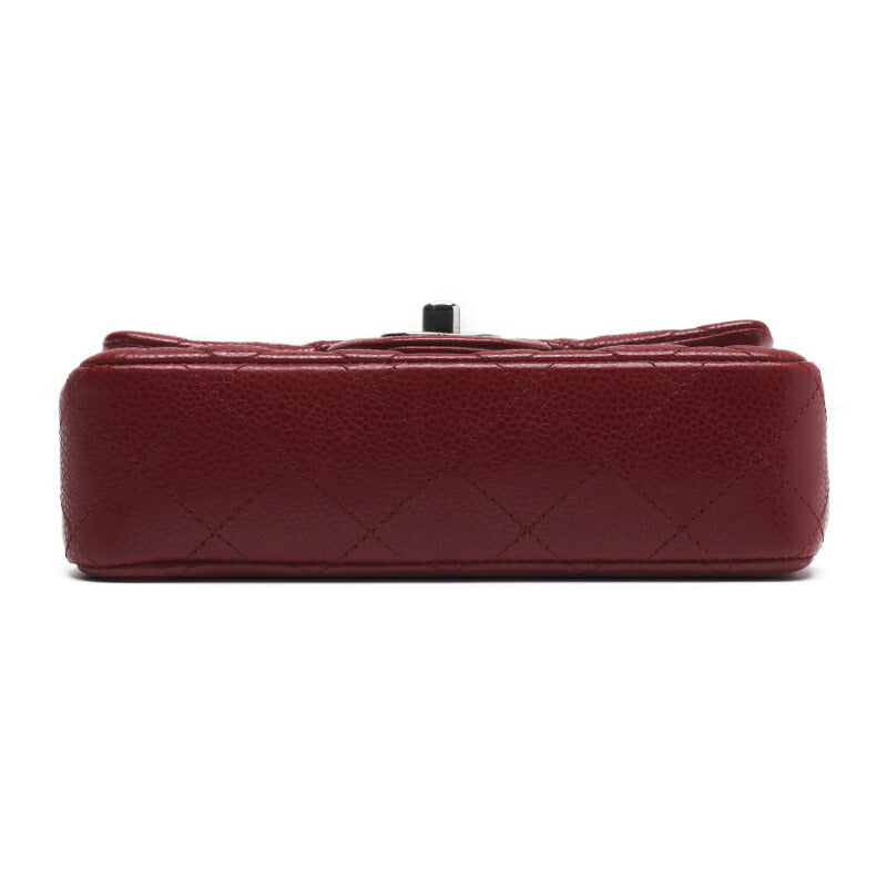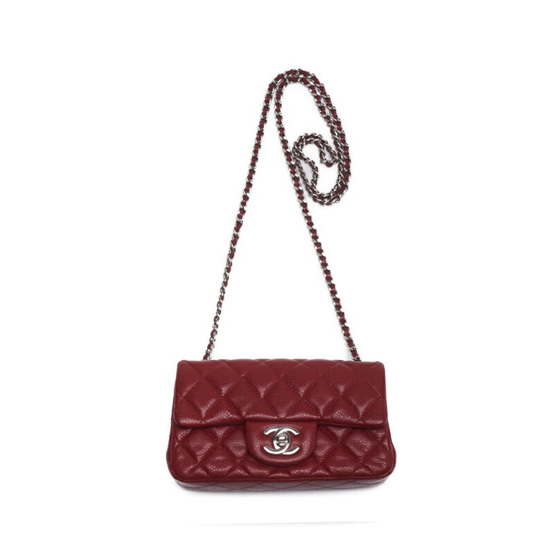 Mini sac à bandoulière matelassé d'occasion, bandoulière chaîne, cuir caviar, rouge, matériel argenté.