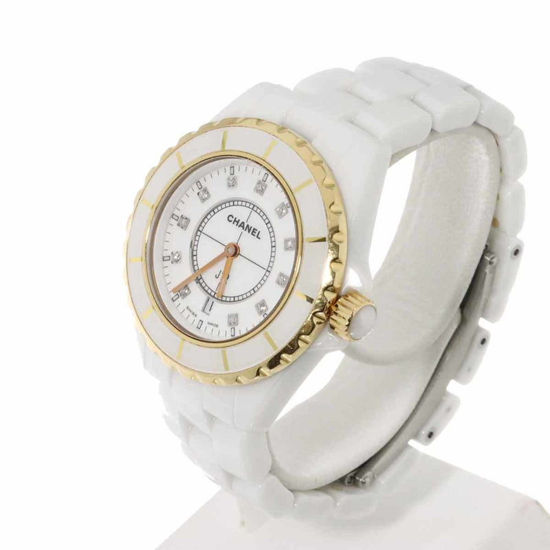 Pre-Owned CHANEL J12 33mm H2181 Women's Watch with 11 Diamonds, Date Display, White Ceramic, and Yellow Gold Quartz Movement