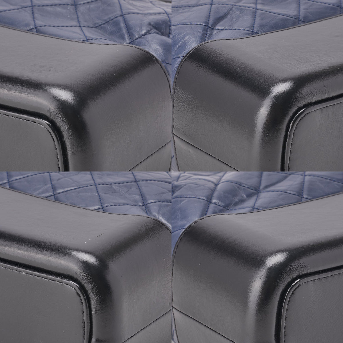 Sac à bandoulière chaîne matelassé vintage en cuir de veau noir, bleu marine et métal doré. D'occasion.