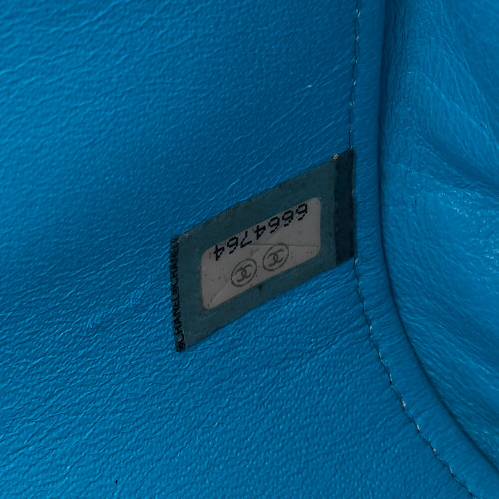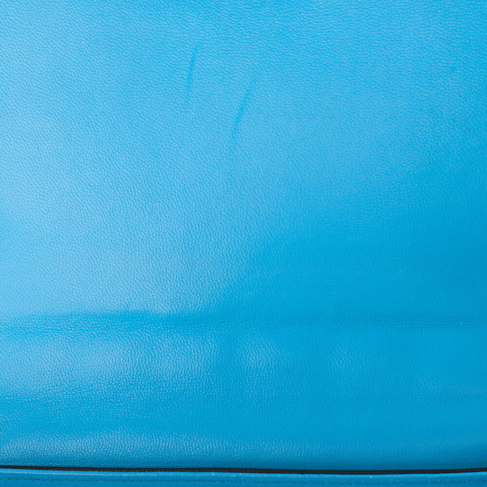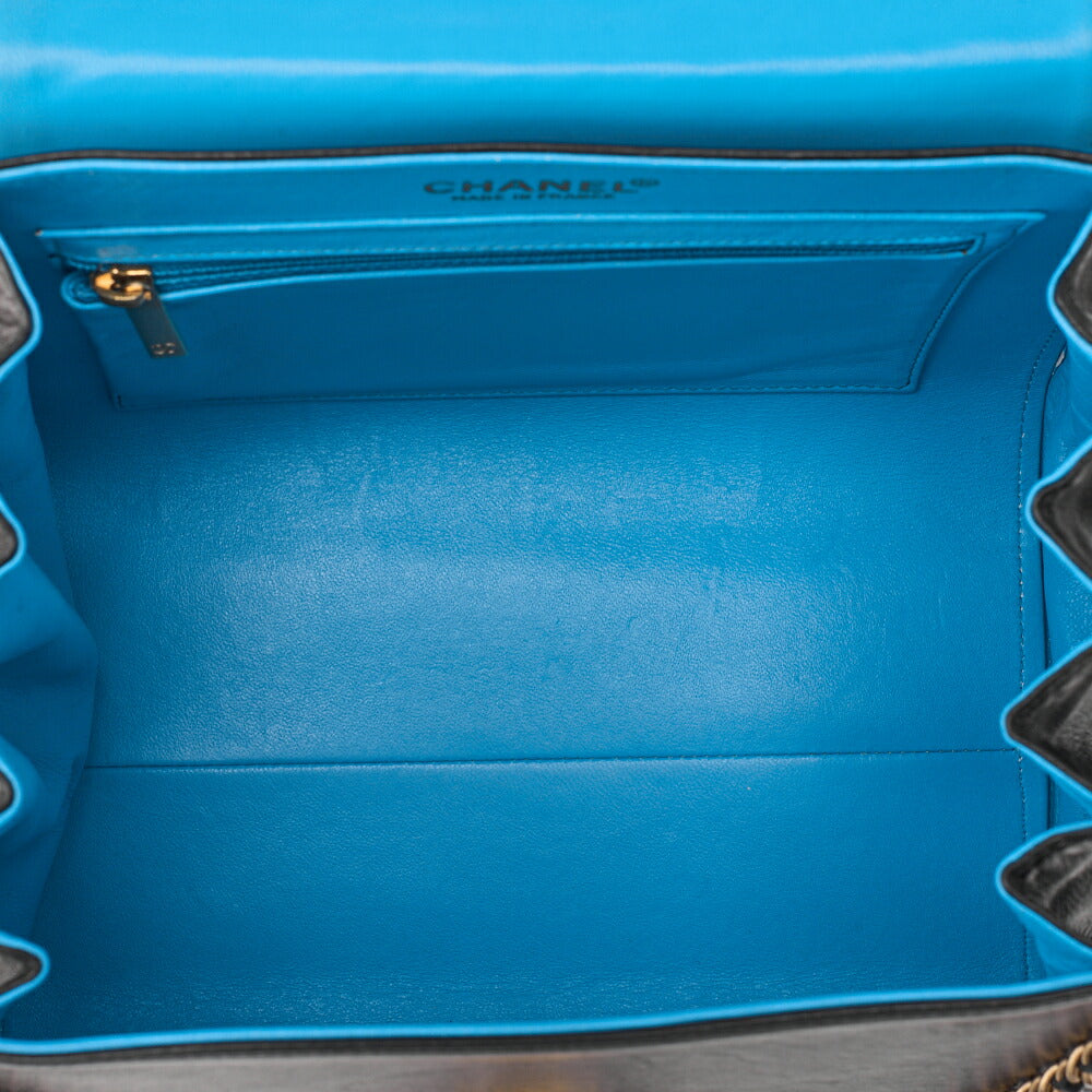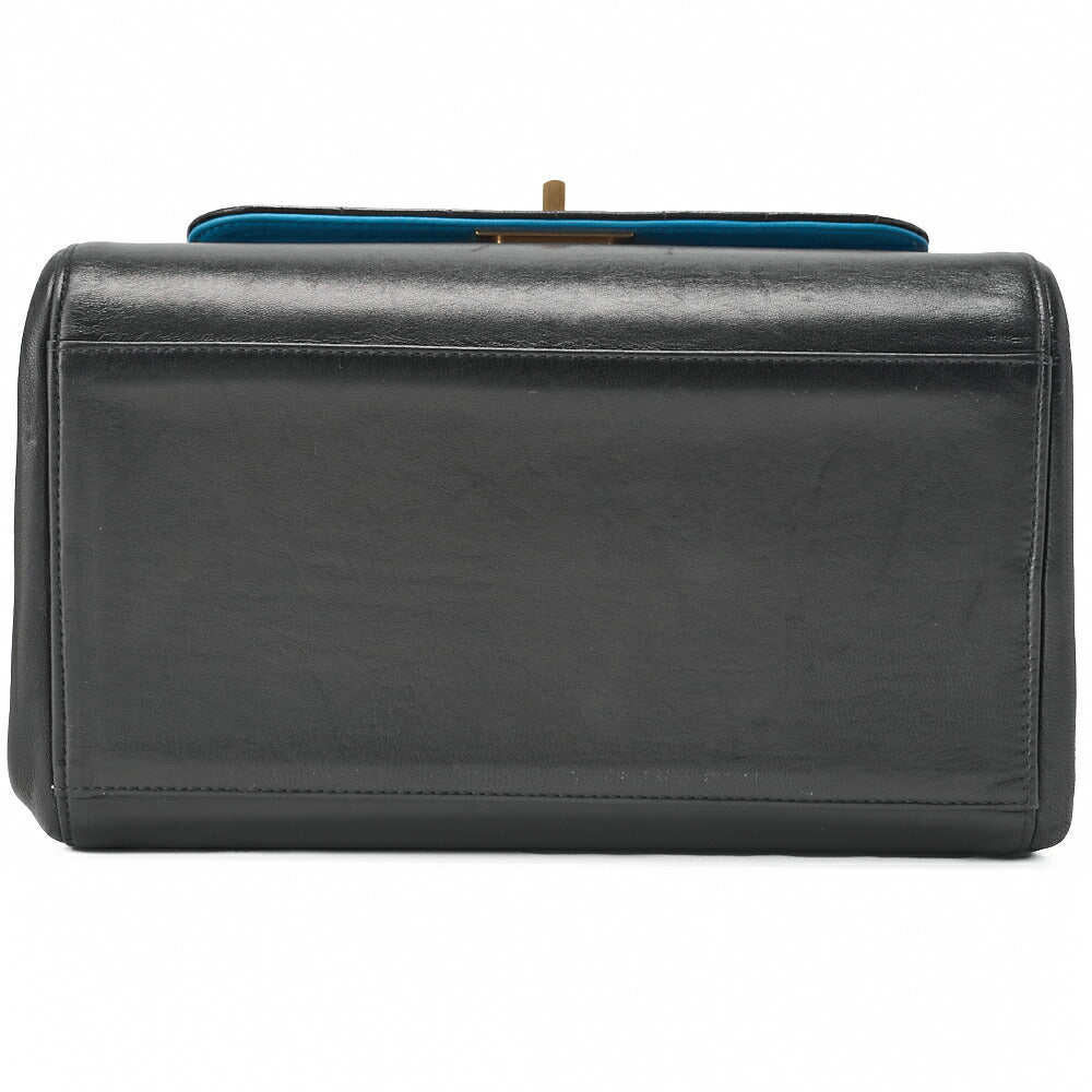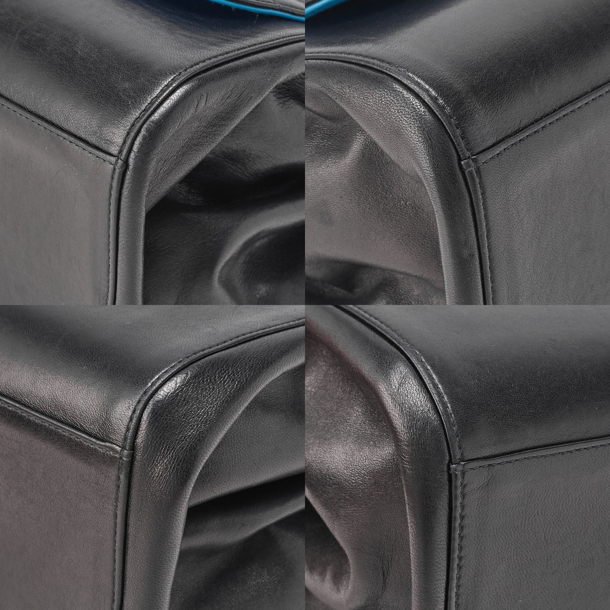 Sac à bandoulière en cuir d'agneau noir et bleu, d'occasion, avec chaîne et fermoir de 2,55 po, avec quincaillerie dorée.