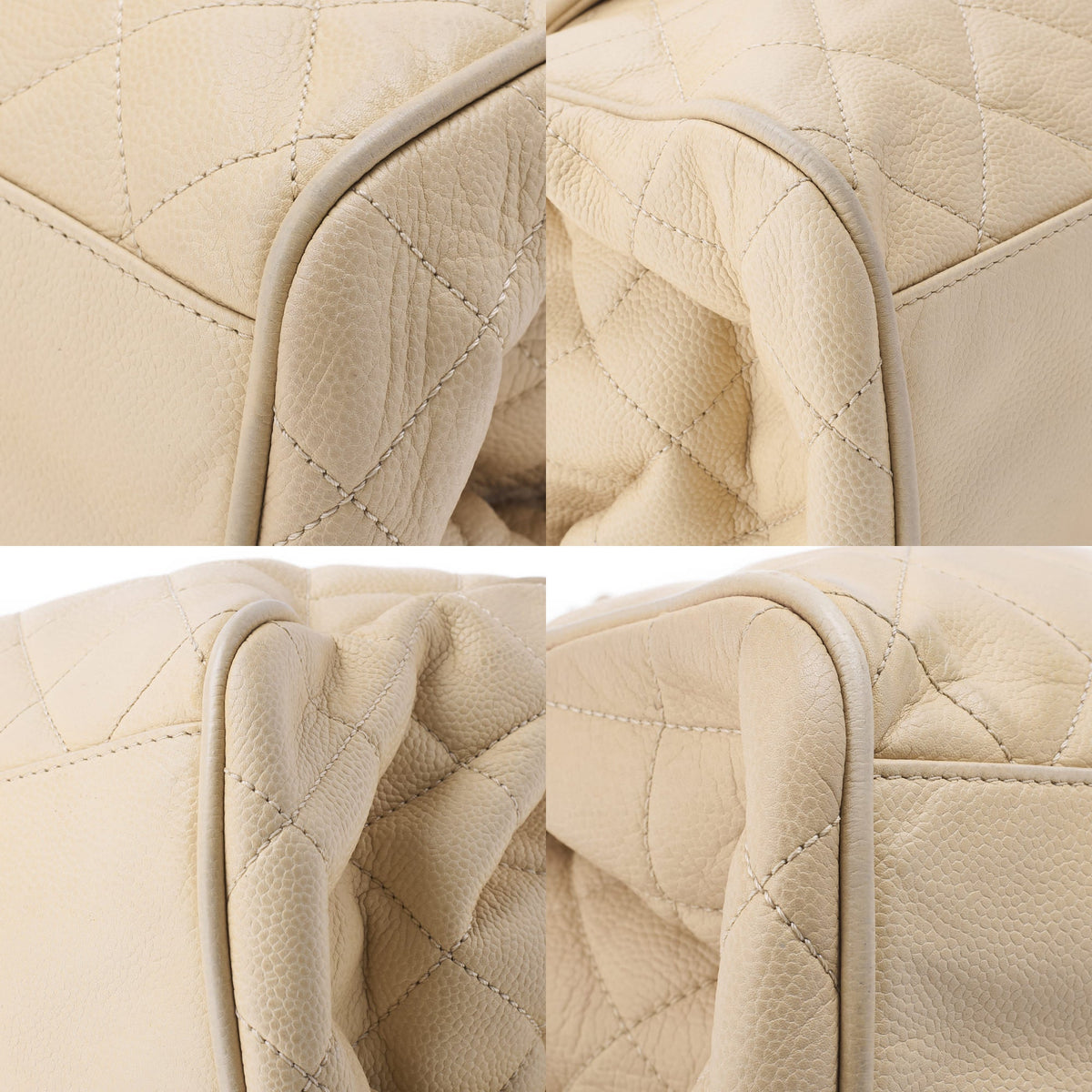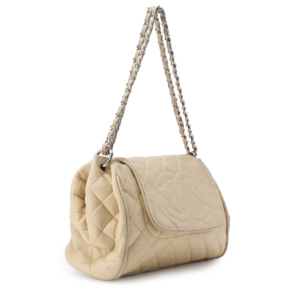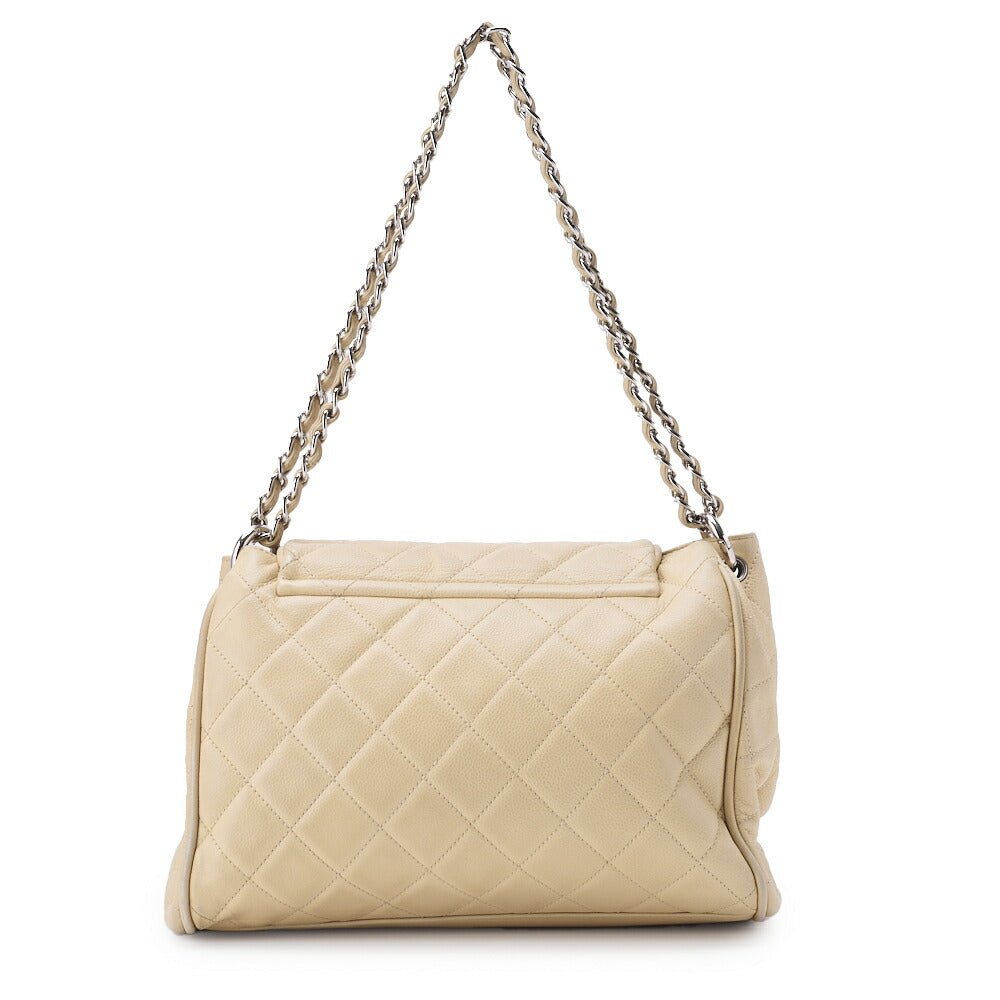 Sac bandoulière d'occasion, matelassé, bandoulière chaîne, cuir caviar, ivoire, finitions argentées, d'occasion