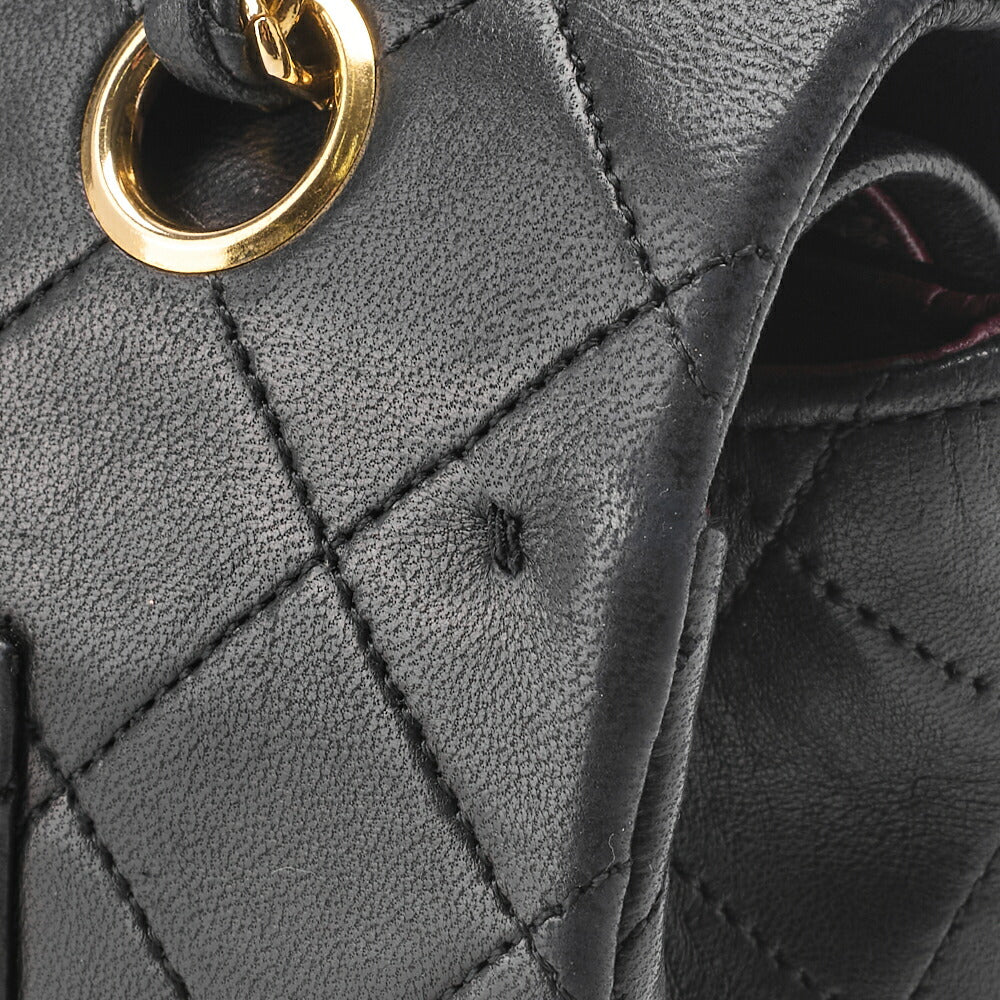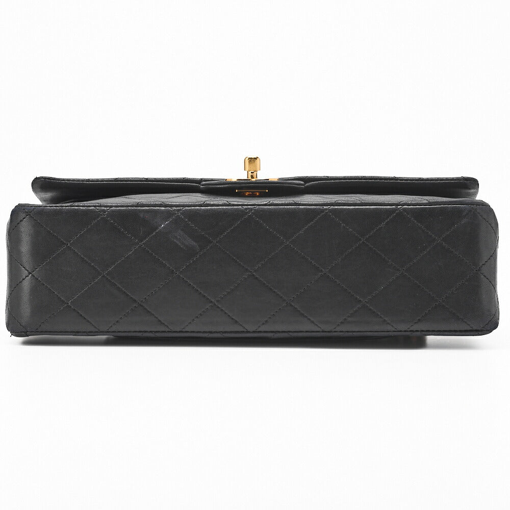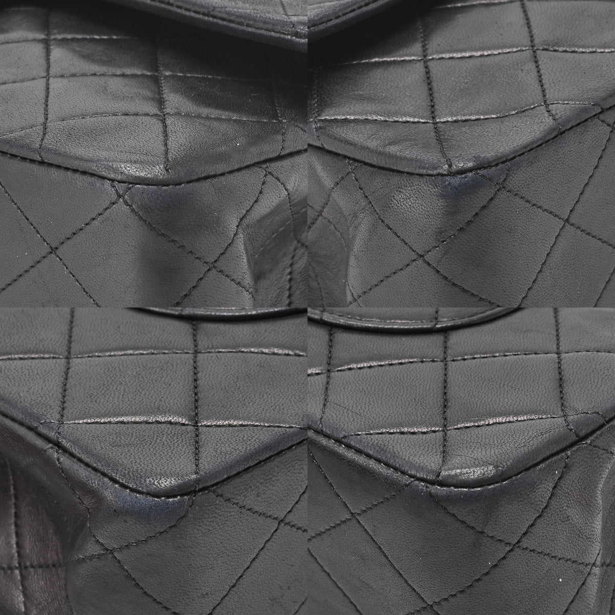 Sac bandoulière d'occasion, double rabat matelassé, cuir d'agneau, noir, finitions dorées.