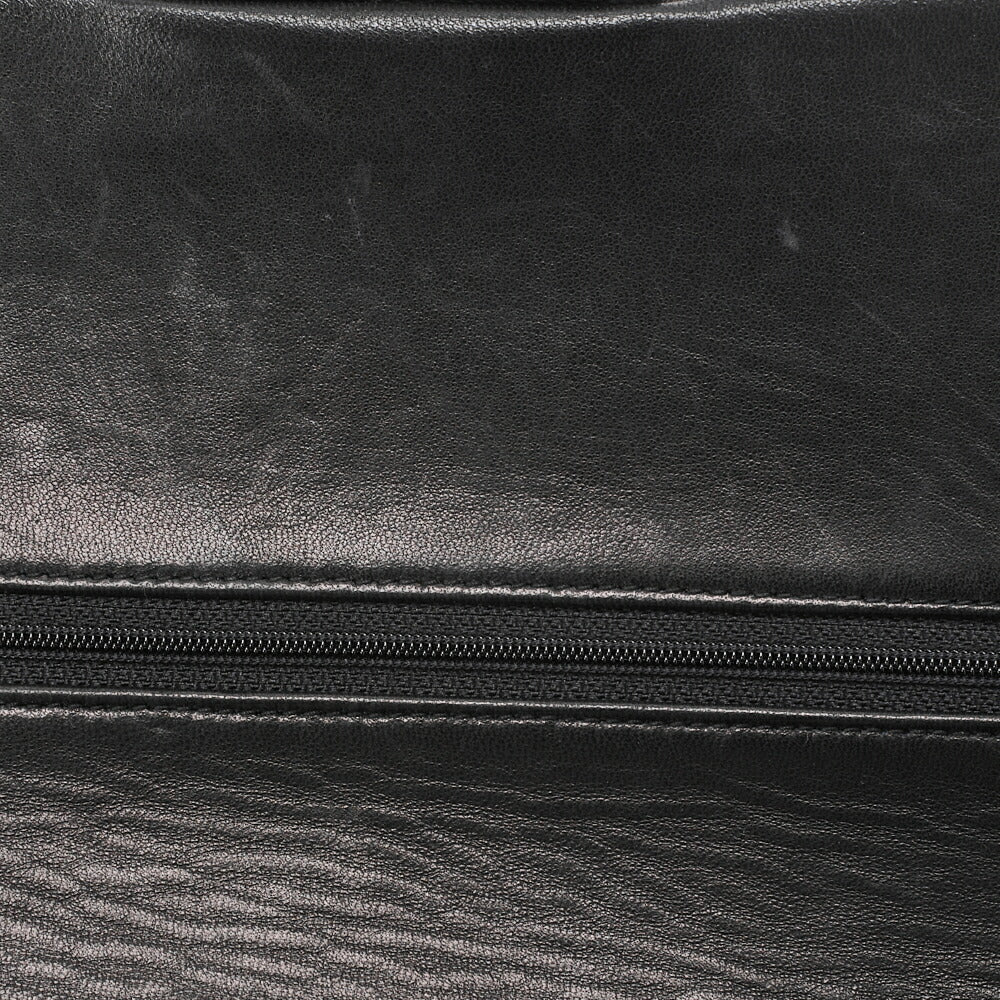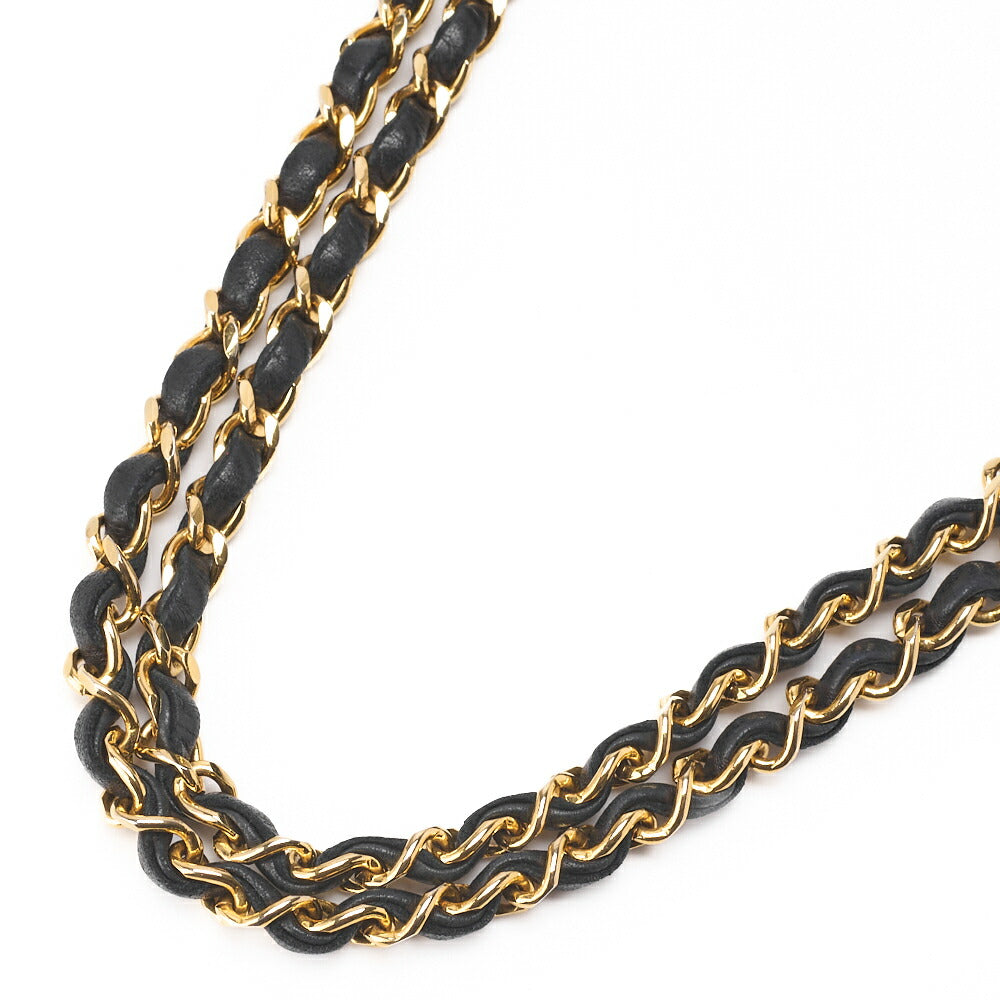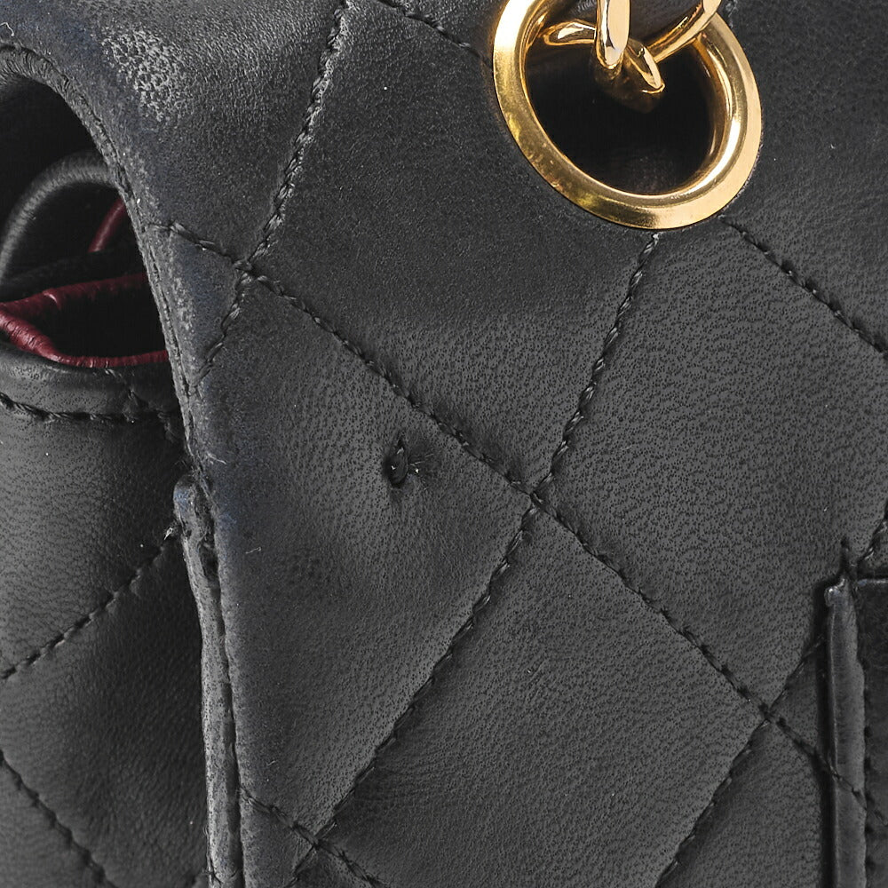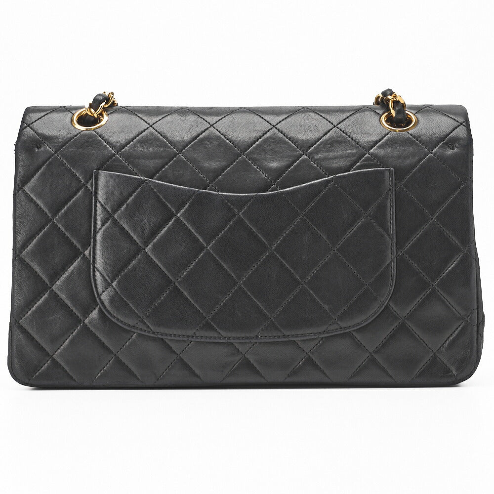 Sac bandoulière d'occasion, double rabat matelassé, cuir d'agneau, noir, finitions dorées.