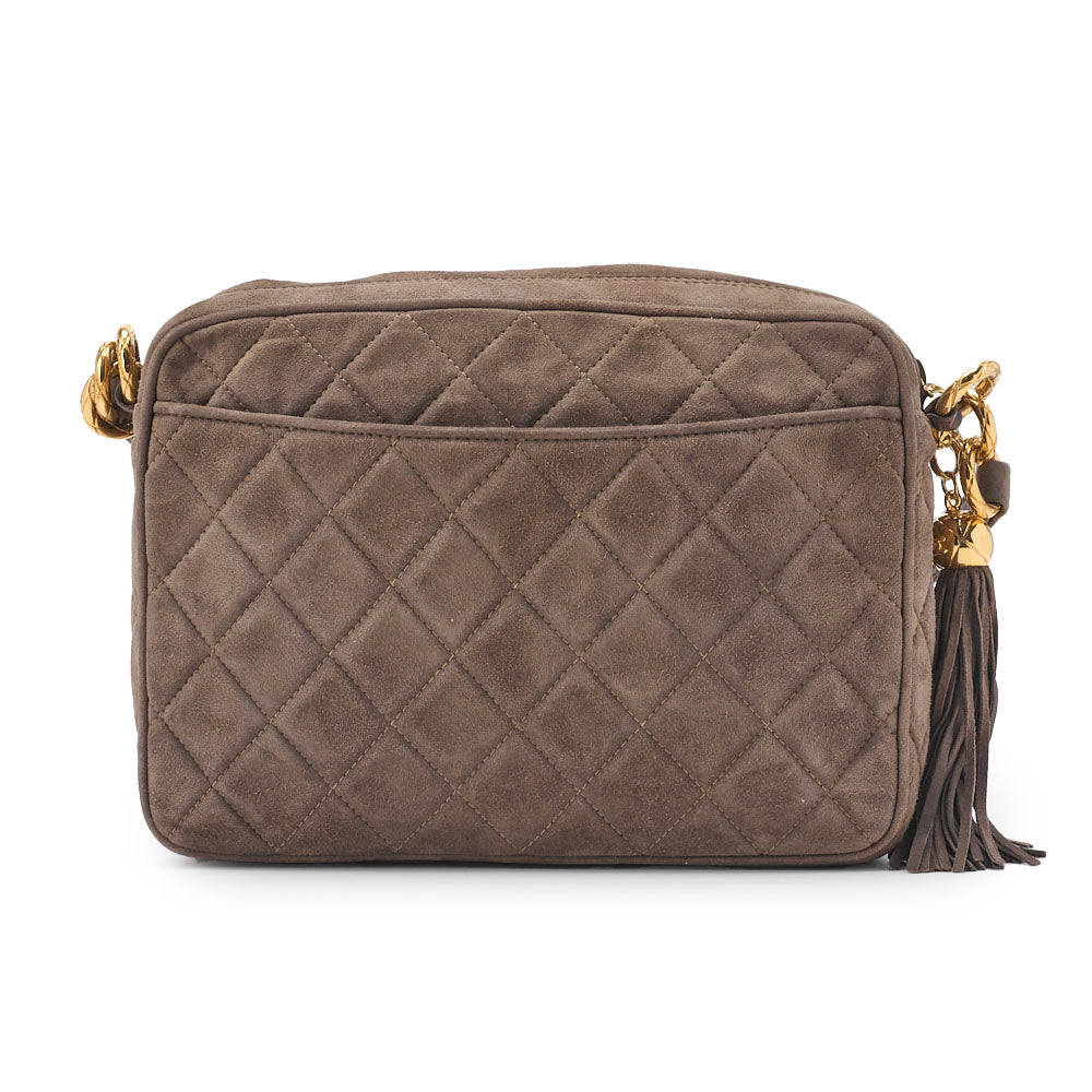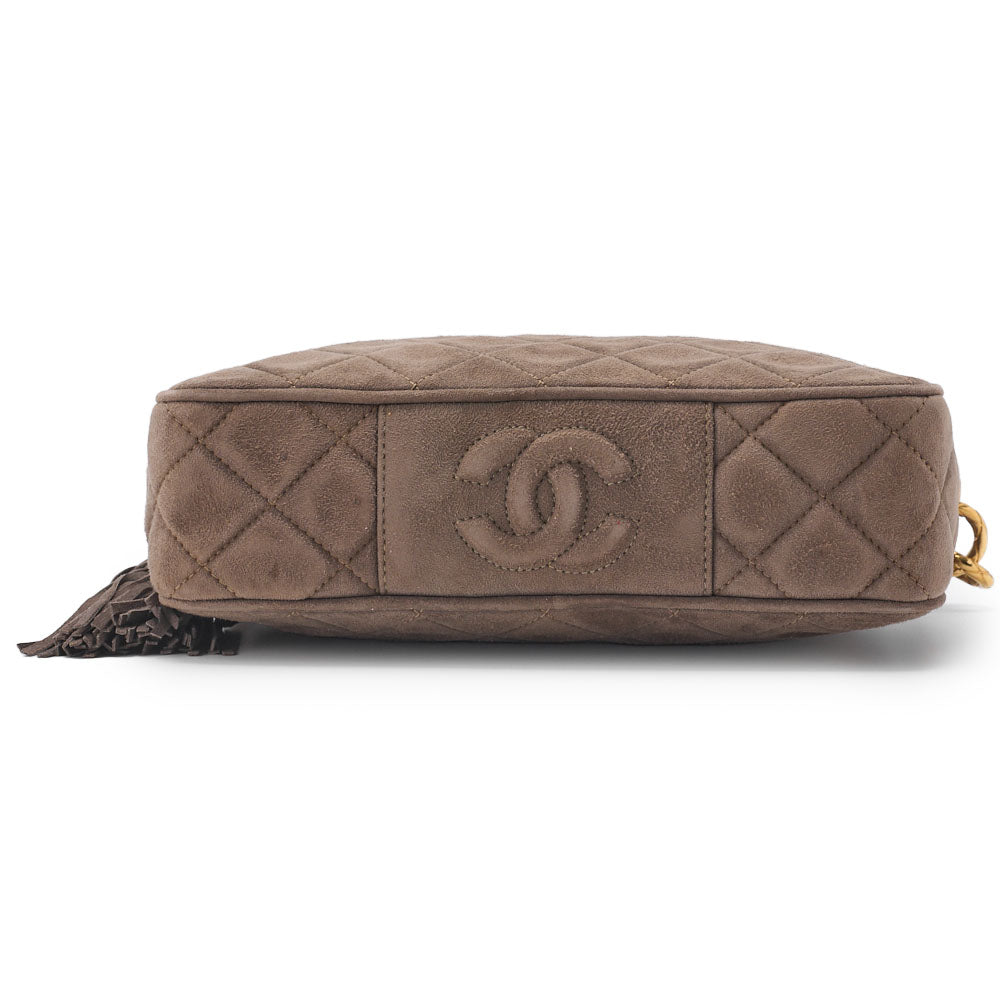 Sublimez votre style avec le luxueux sac bandoulière matelassé à franges CHANEL , confectionné en daim haut de gamme dans une élégante teinte gris-beige . Ce mini sac bandoulière est l'incarnation même de la sophistication, conçu pour la femme moderne qui apprécie la haute couture.
