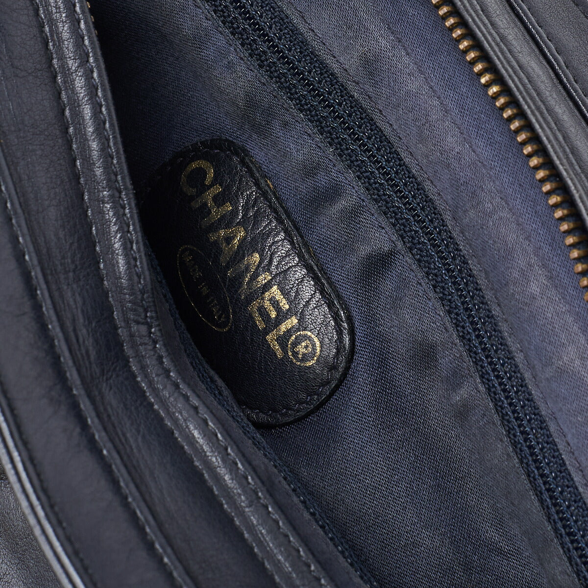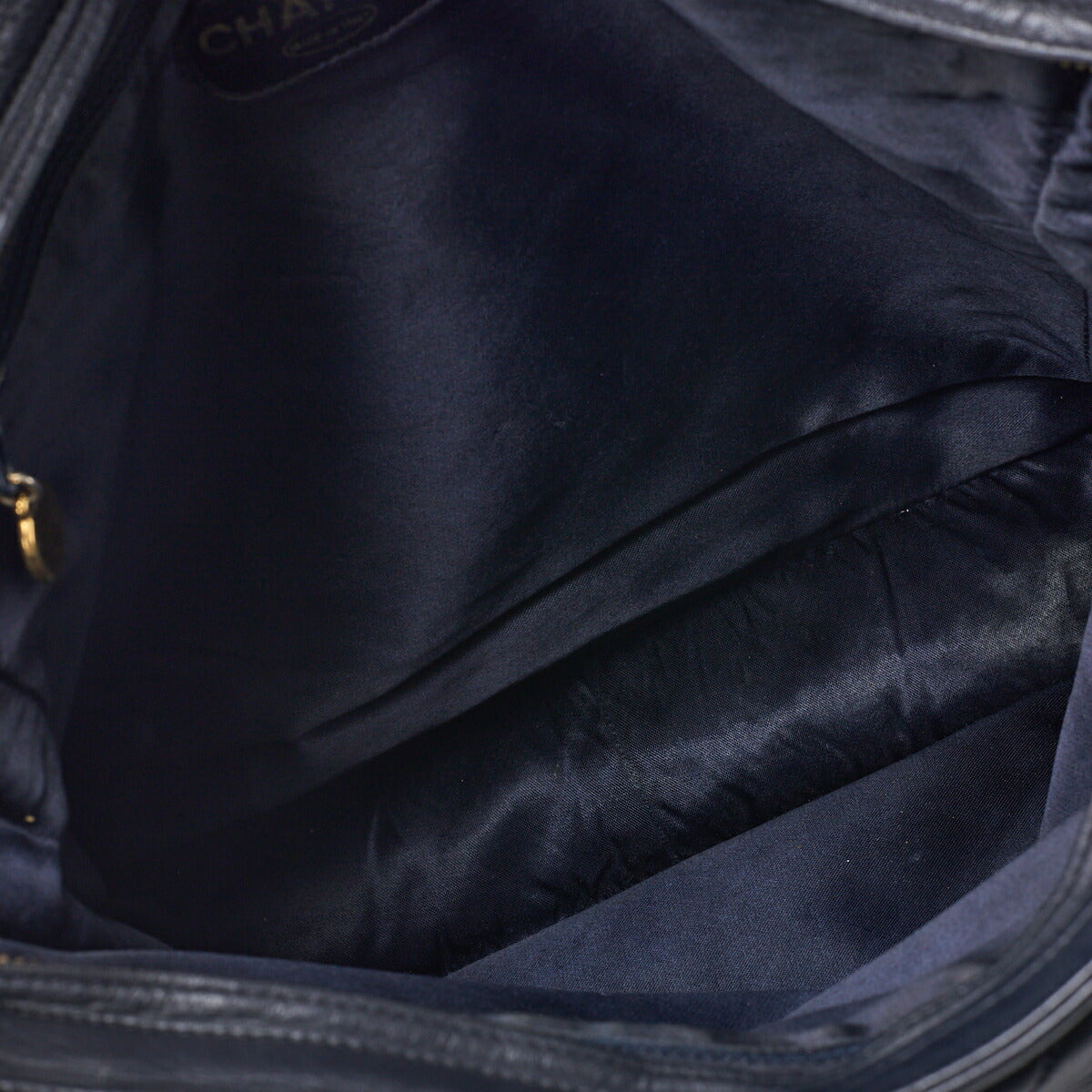 Sac à bandoulière matelassé d'occasion, rabat extérieur, cuir d'agneau bleu marine, accessoires dorés.