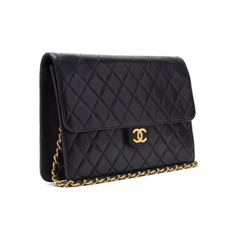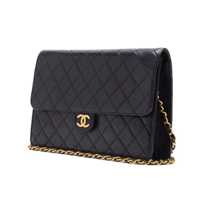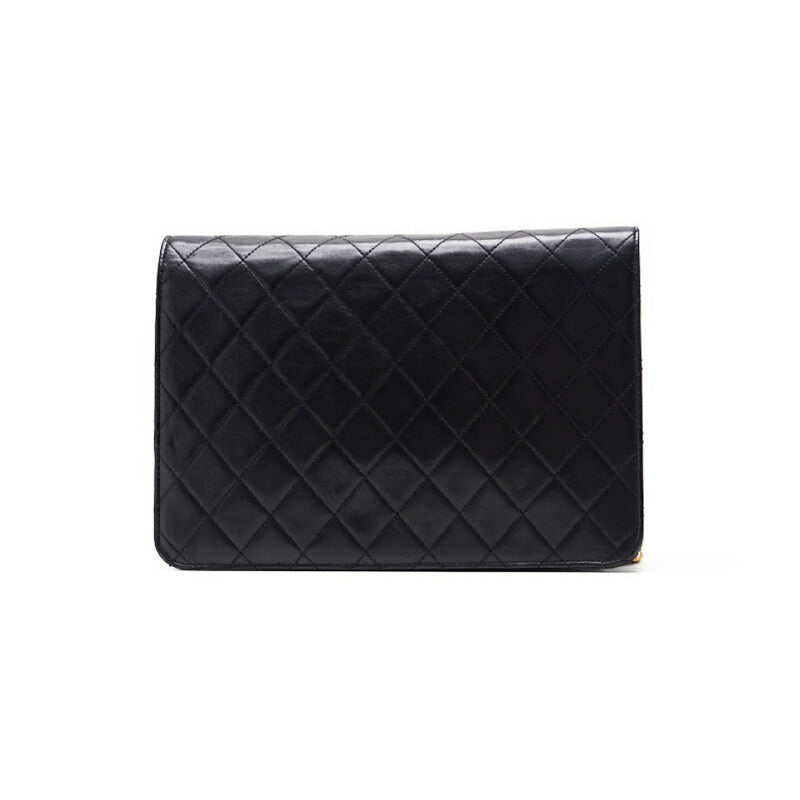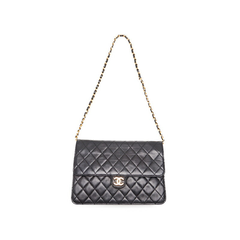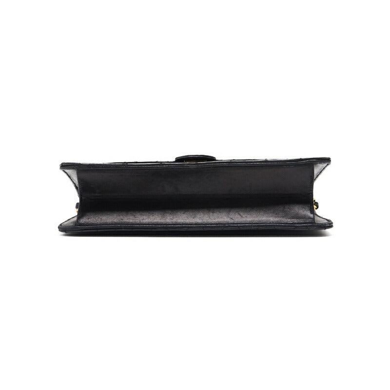 Sac bandoulière d'occasion, Matelasse, fermeture à pression, cuir d'agneau, noir, finitions dorées.