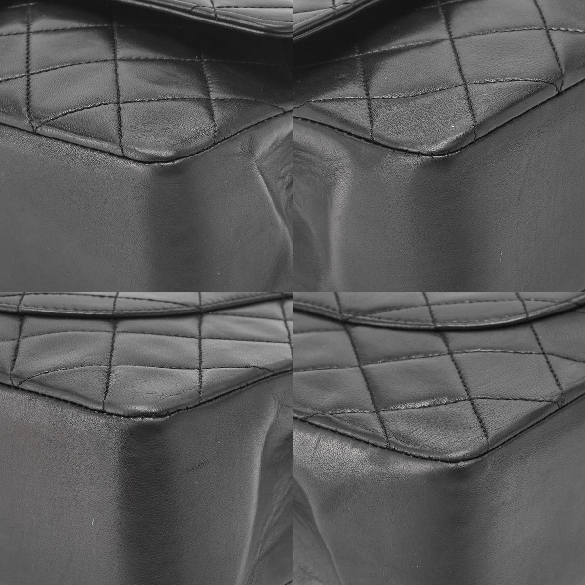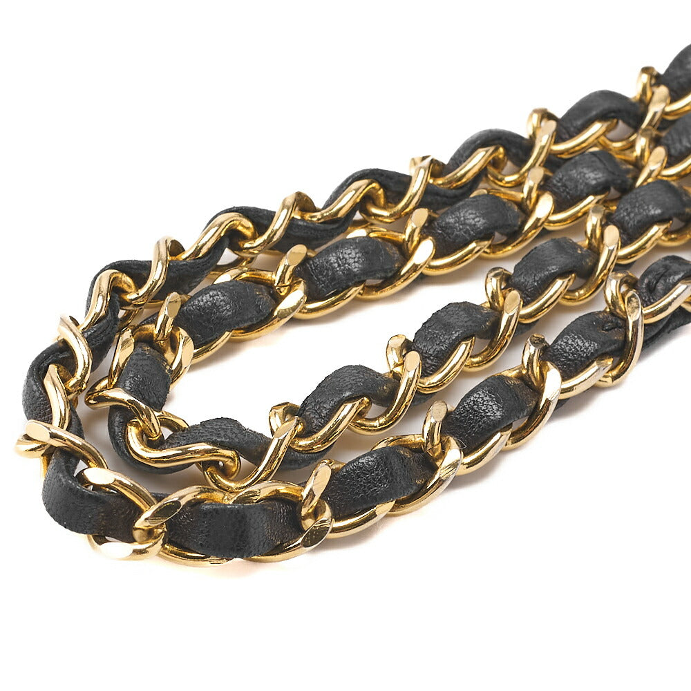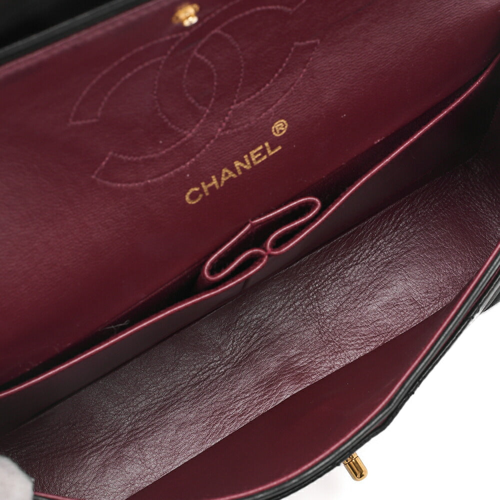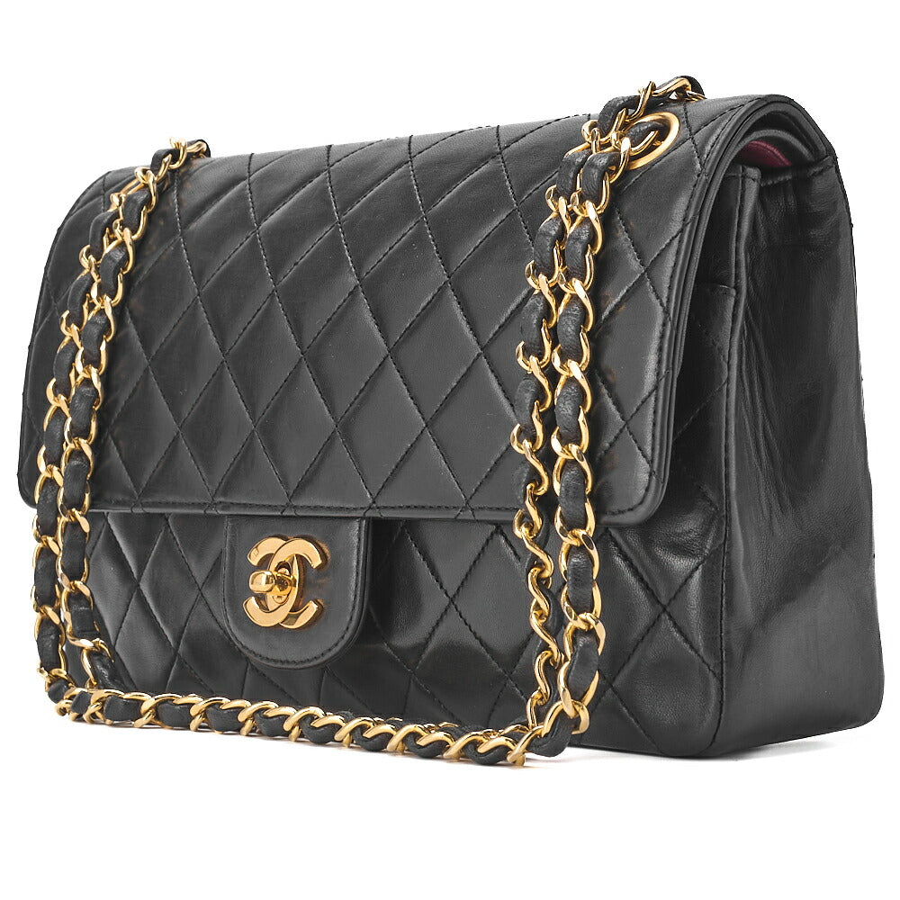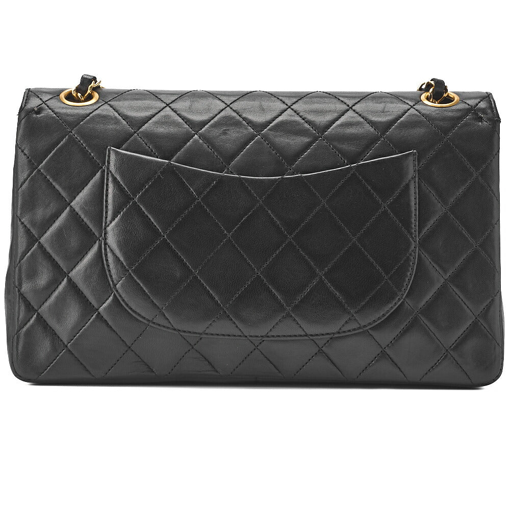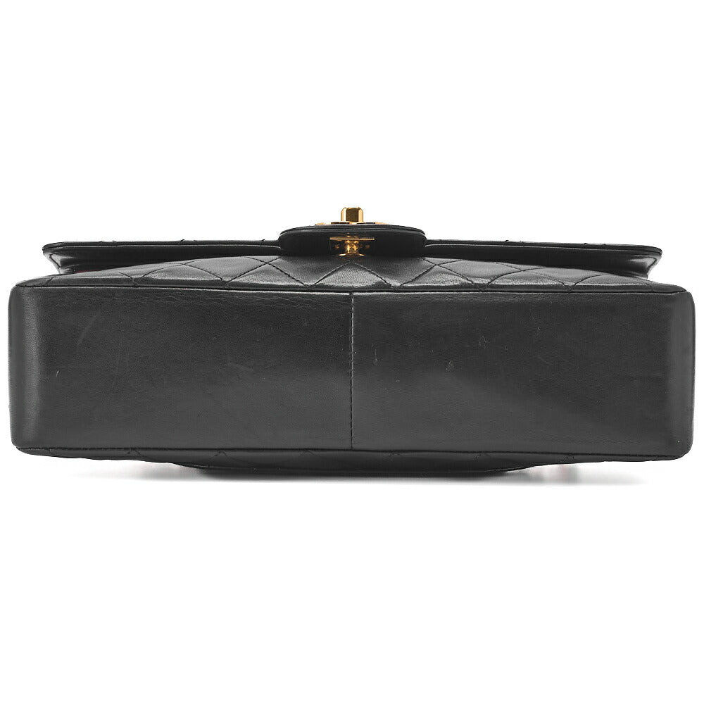 Sac bandoulière d'occasion, matelassé, double rabat droit, fermoir tournant, cuir d'agneau, noir, finitions dorées.