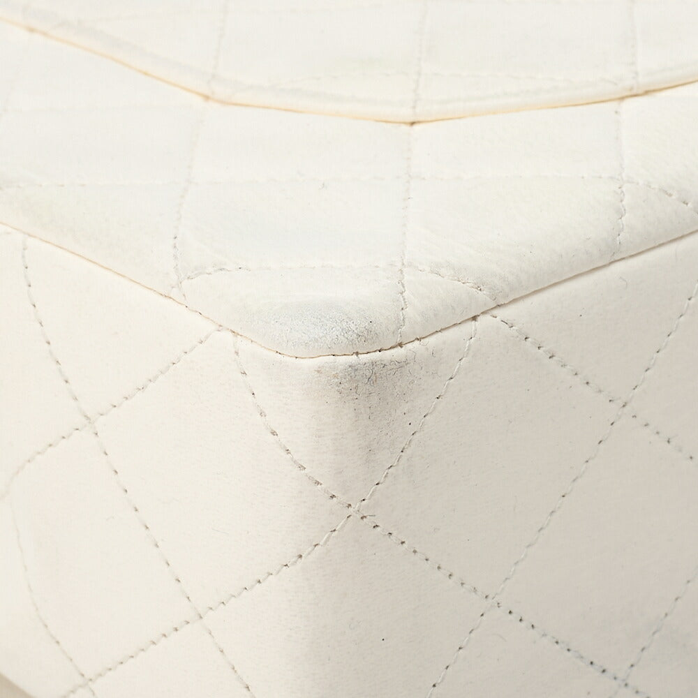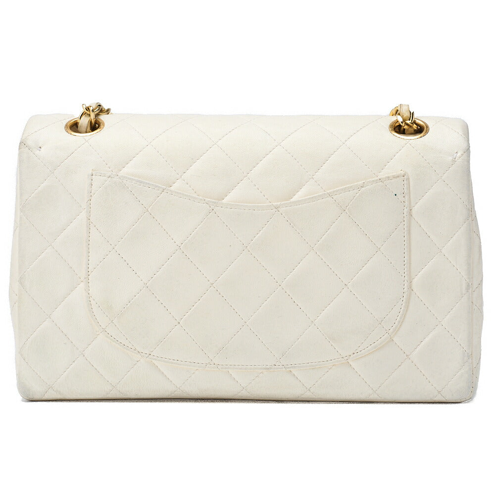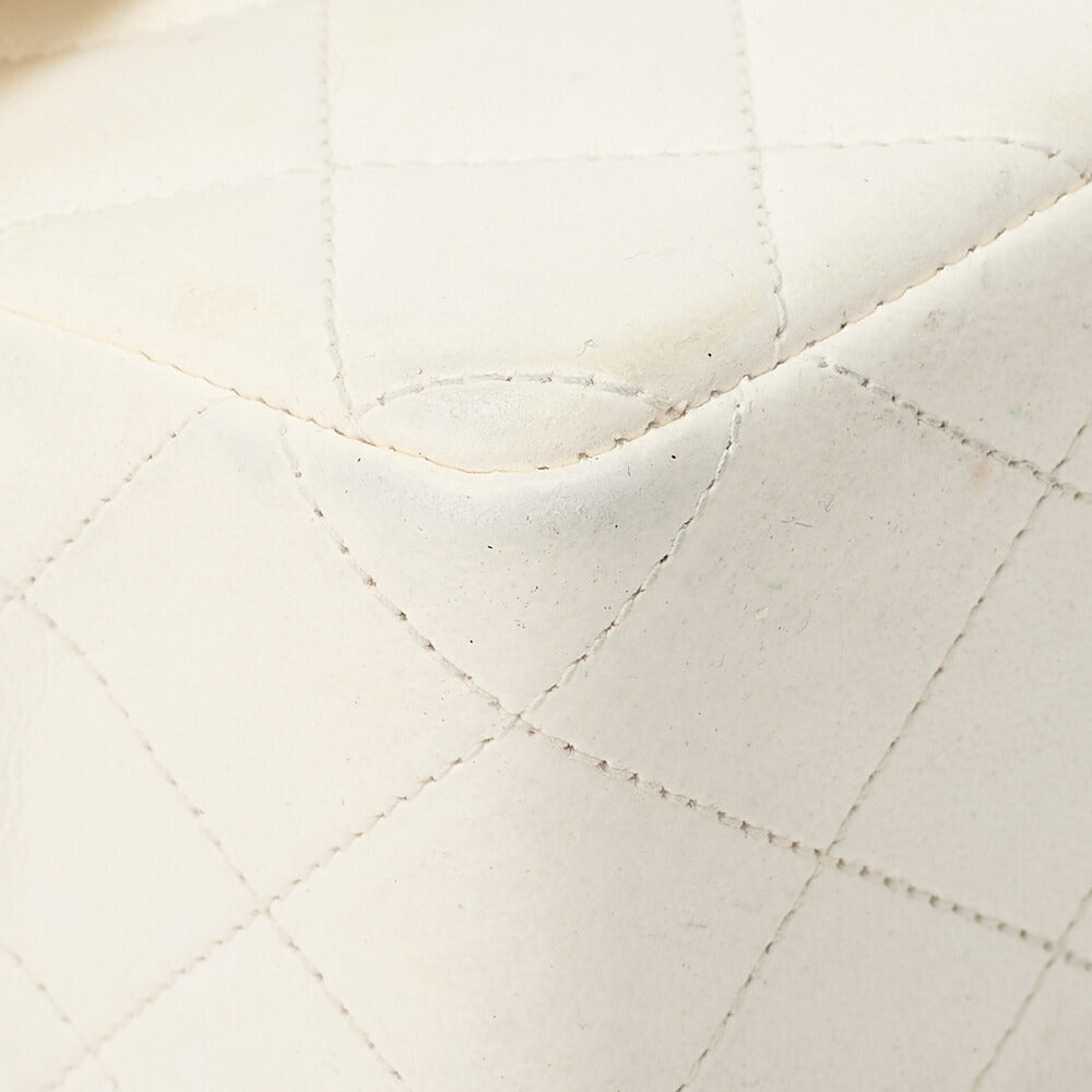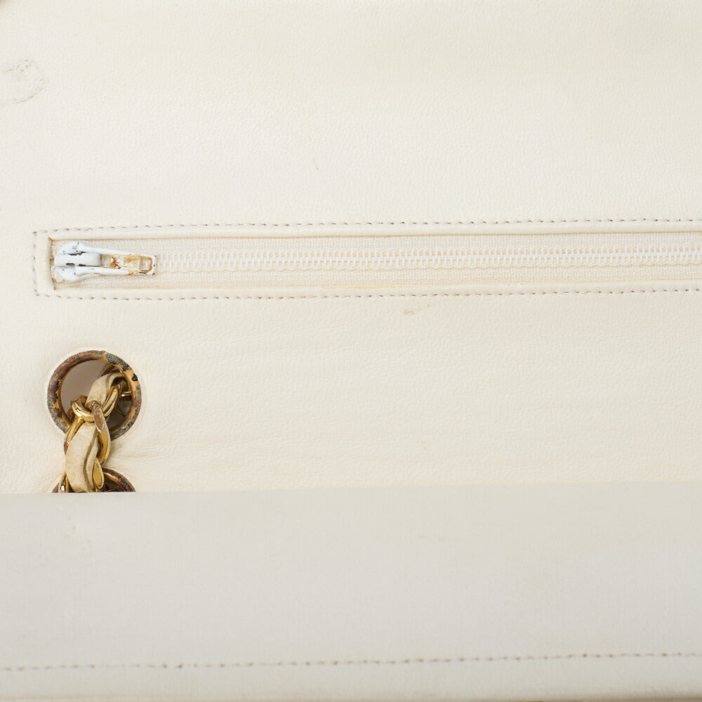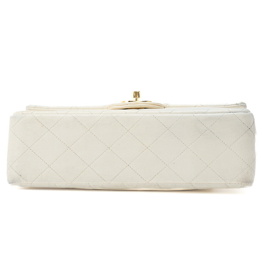 Sac bandoulière d'occasion, rabat matelassé, bandoulière chaîne, cuir d'agneau, blanc, finitions dorées, d'occasion