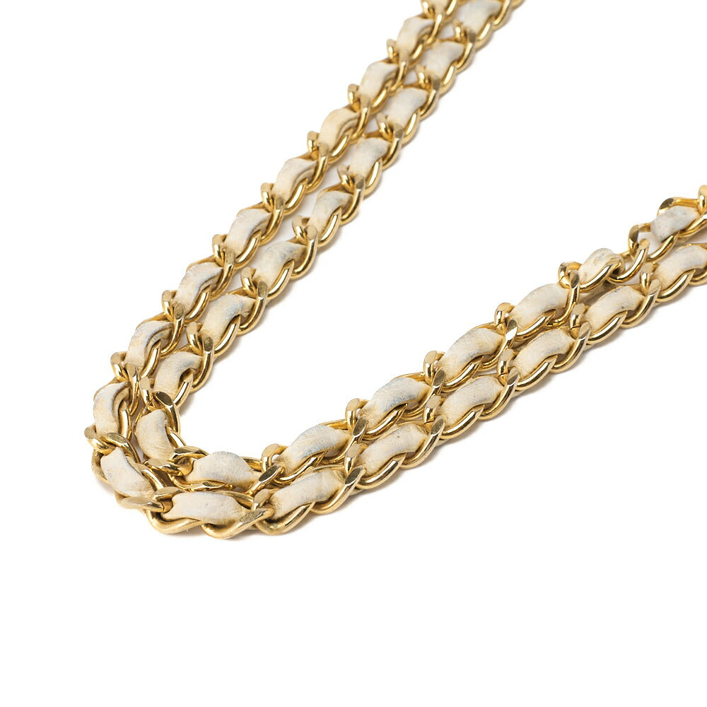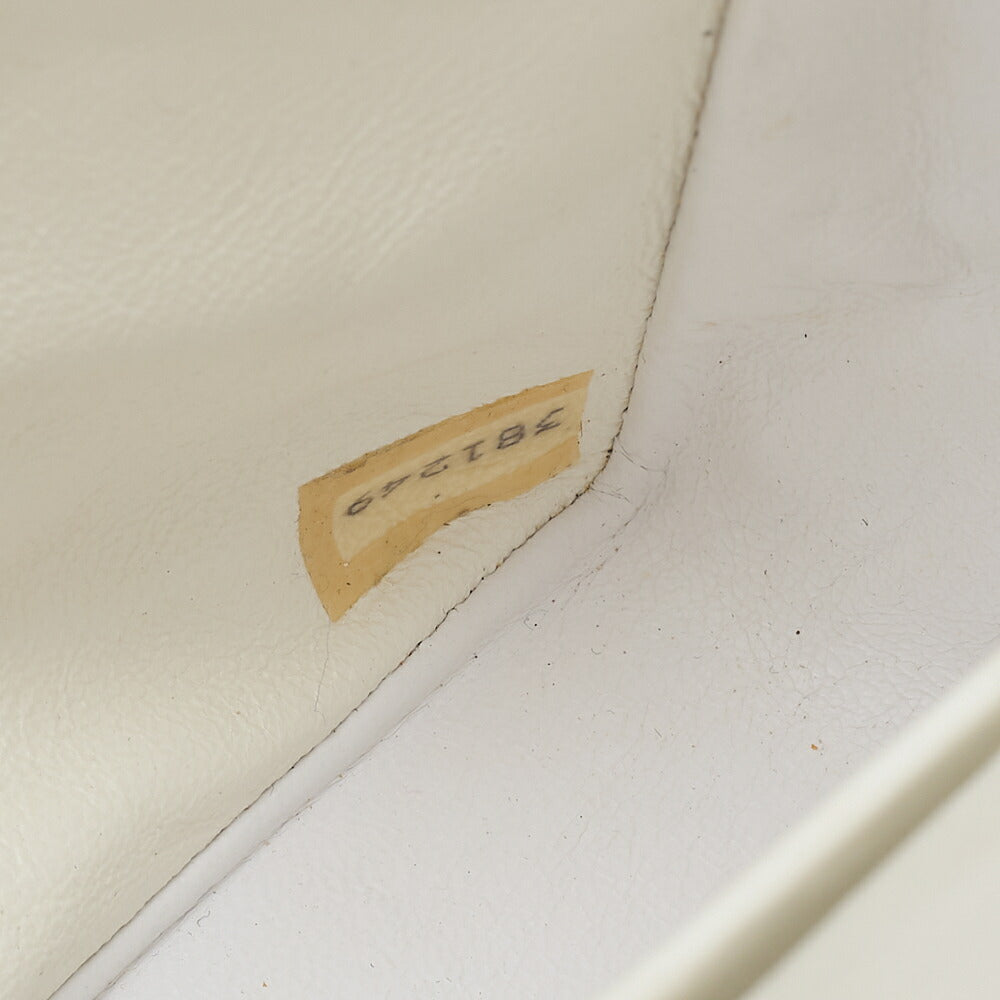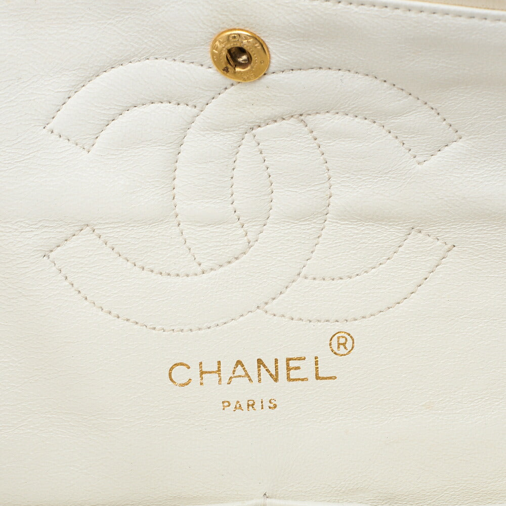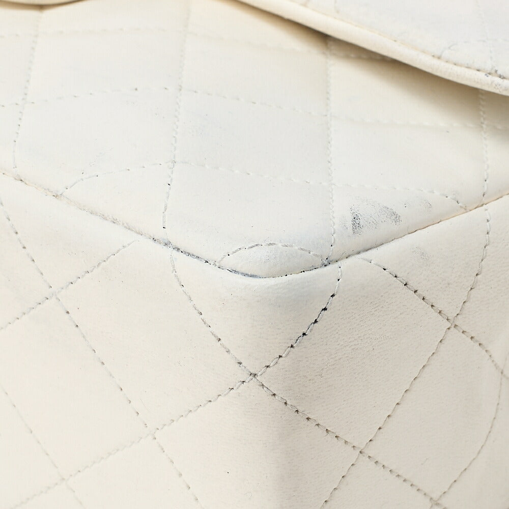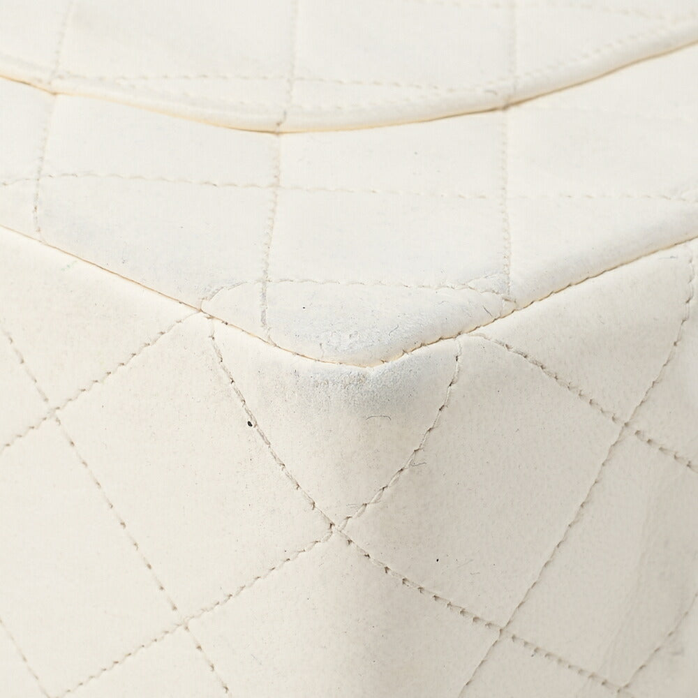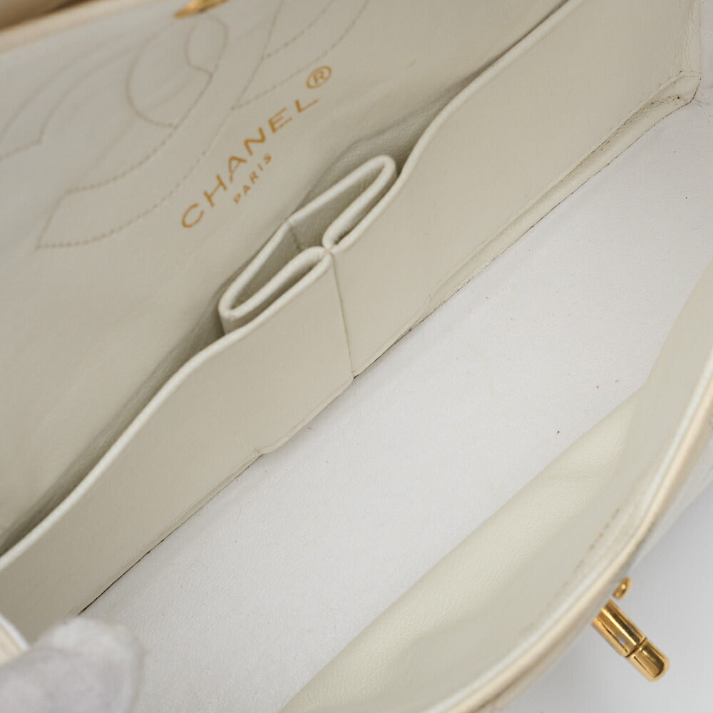 Sac bandoulière d'occasion, rabat matelassé, bandoulière chaîne, cuir d'agneau, blanc, finitions dorées, d'occasion