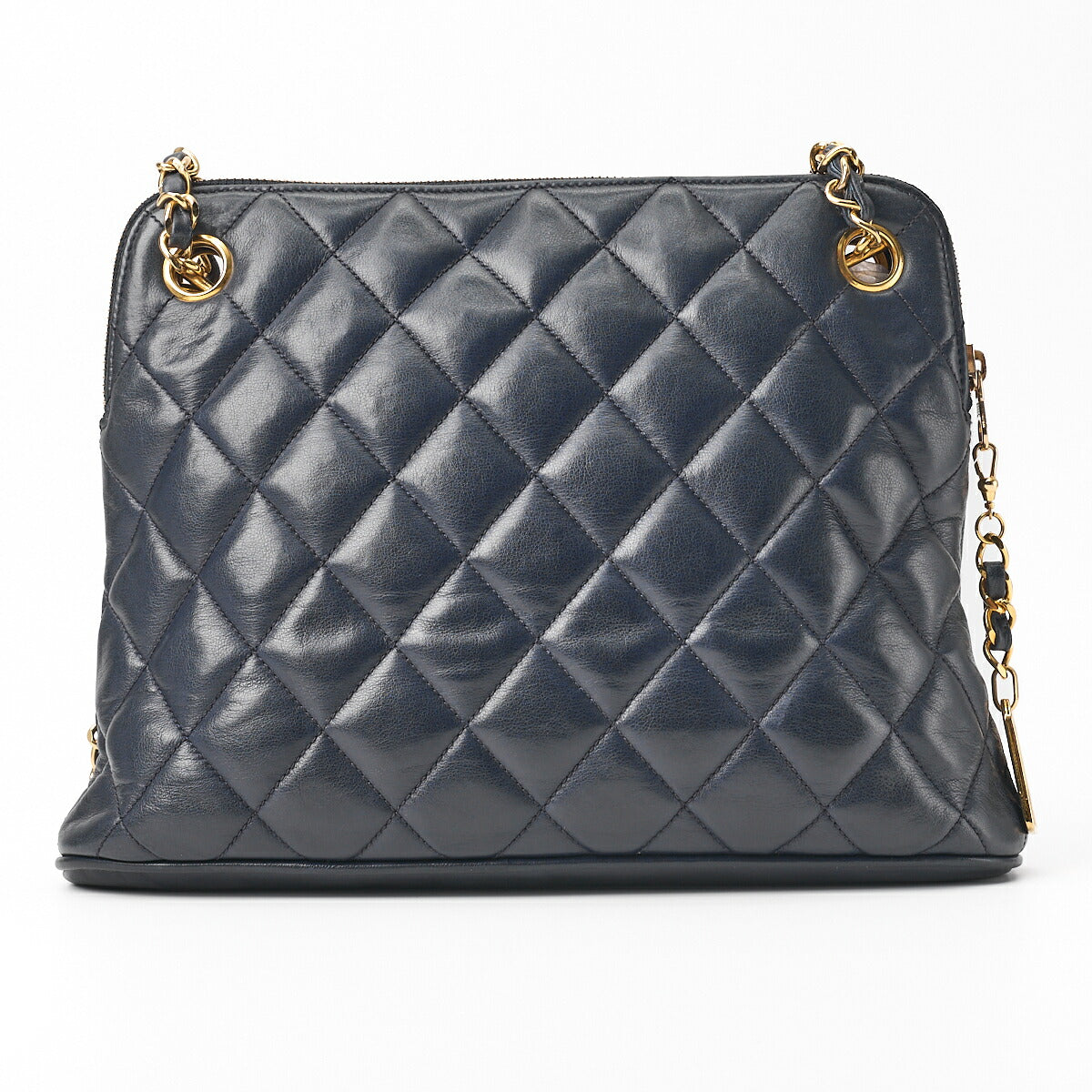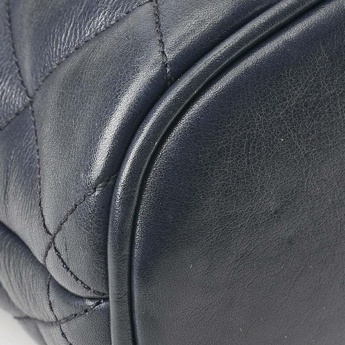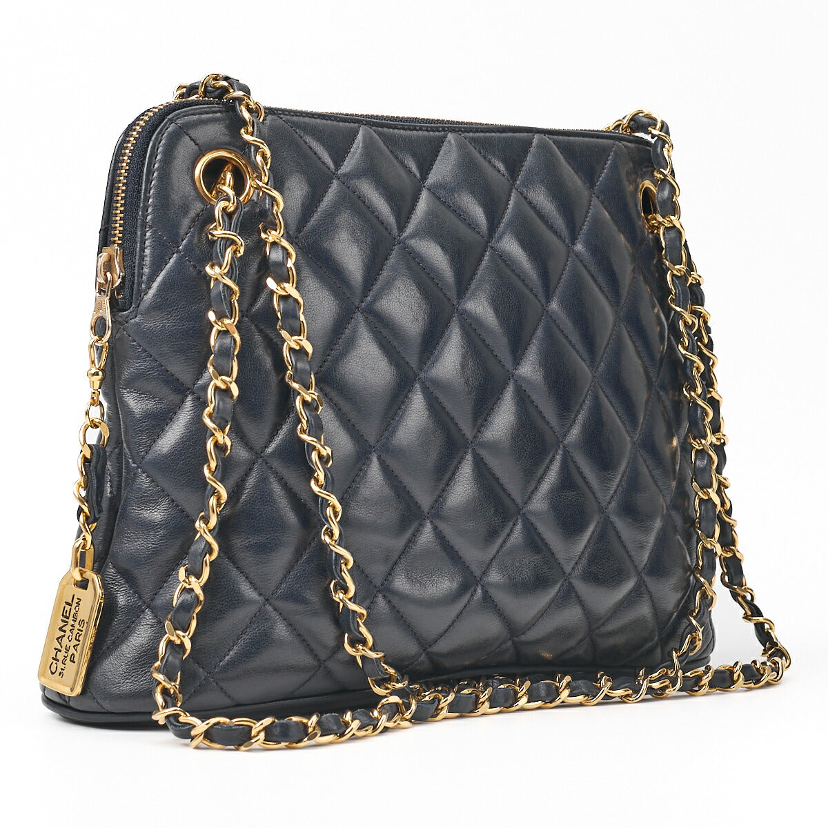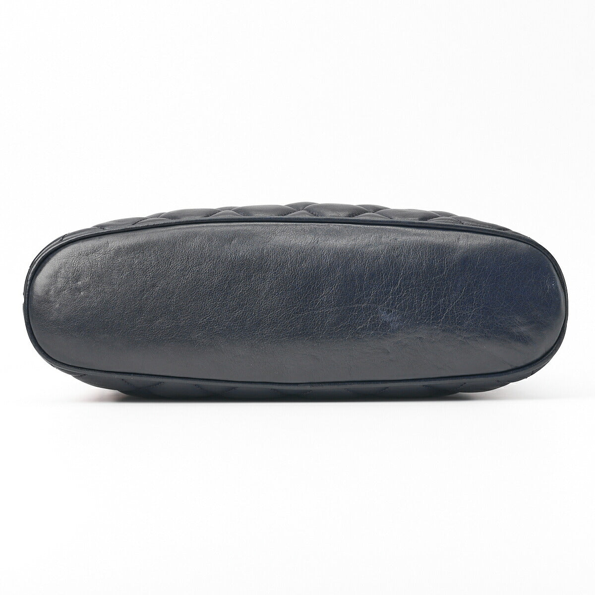 Sac bandoulière d'occasion, matelassé, cuir d'agneau, bleu marine, finitions dorées.