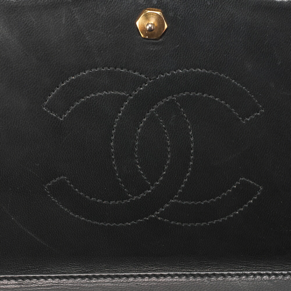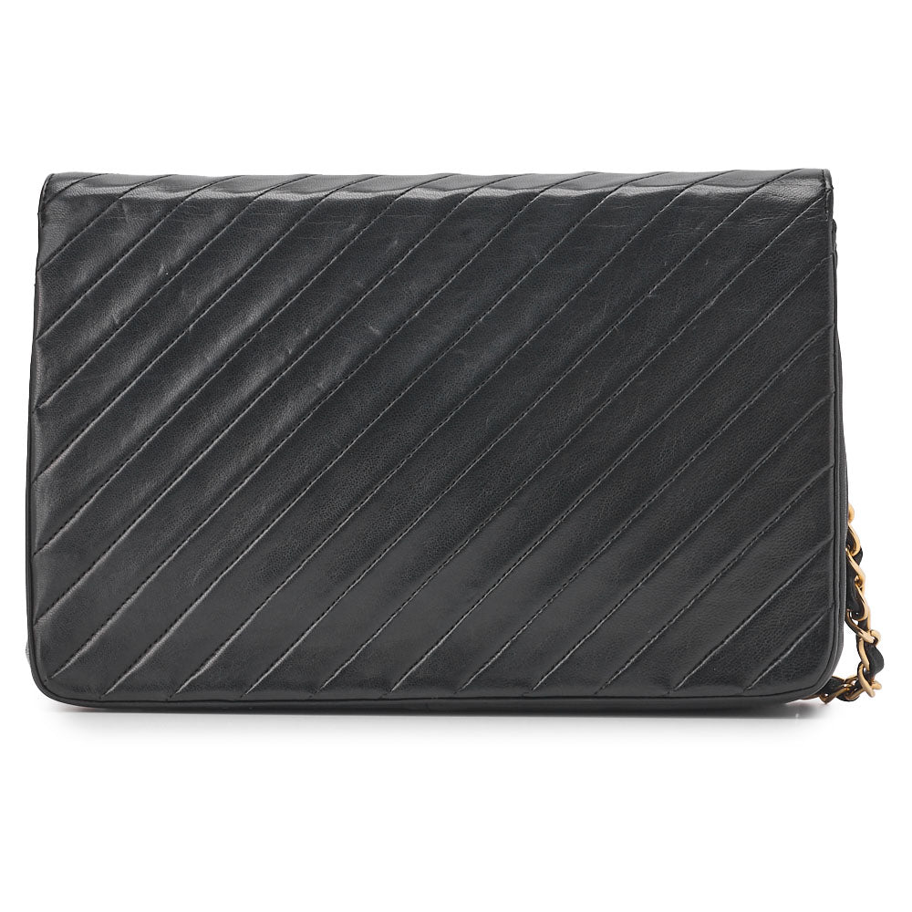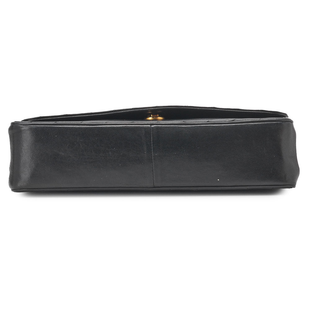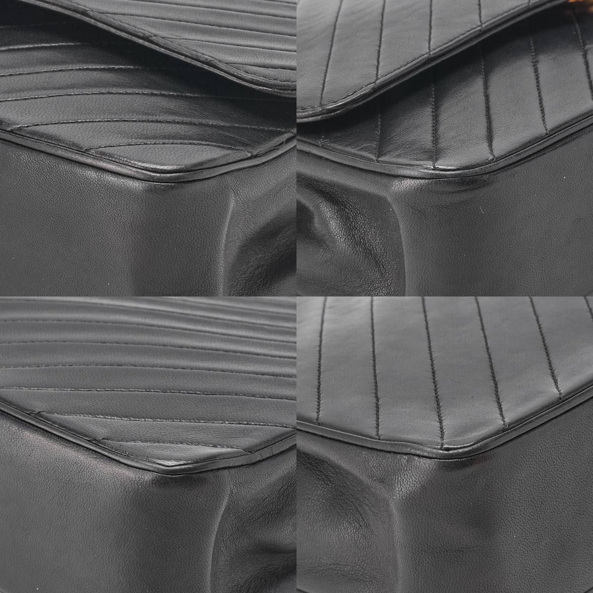 Sac bandoulière d'occasion en cuir d'agneau noir avec coutures en biais et fermoir à pression, quincaillerie dorée.