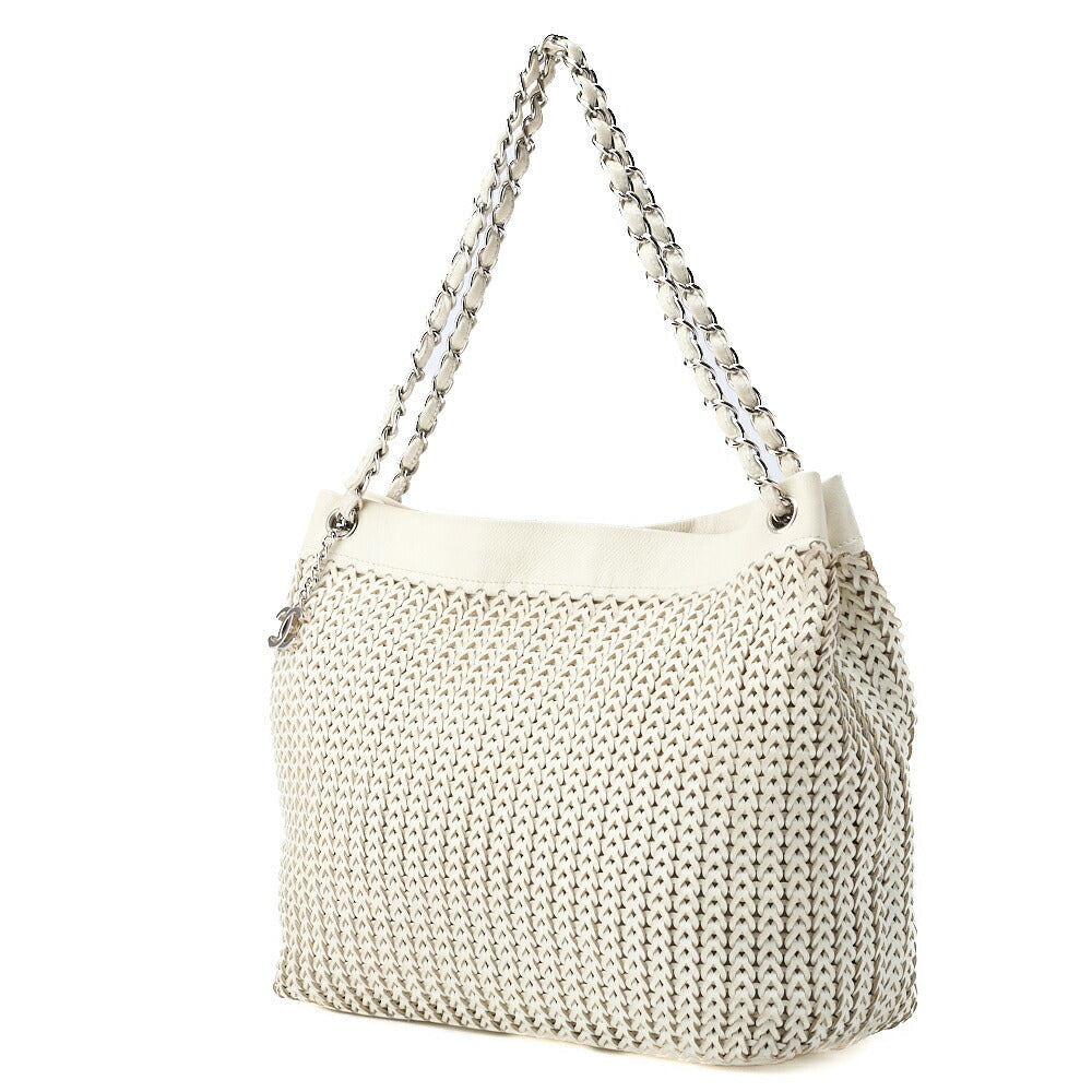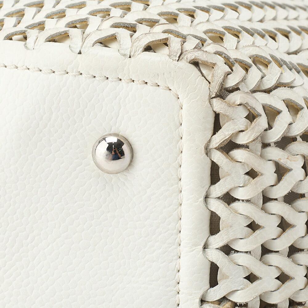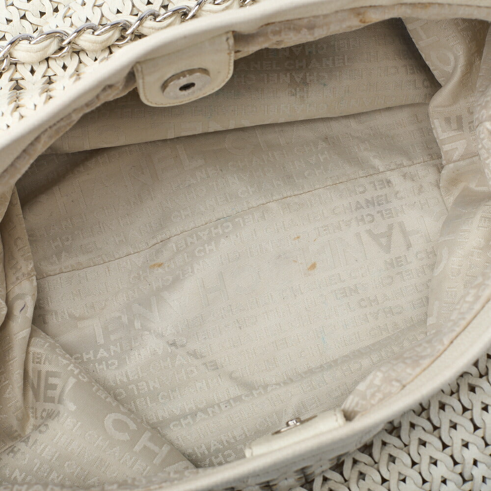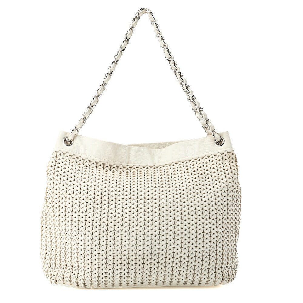Sac fourre-tout à bandoulière d'occasion en cuir tressé avec chaîne et quincaillerie argentée ivoire.