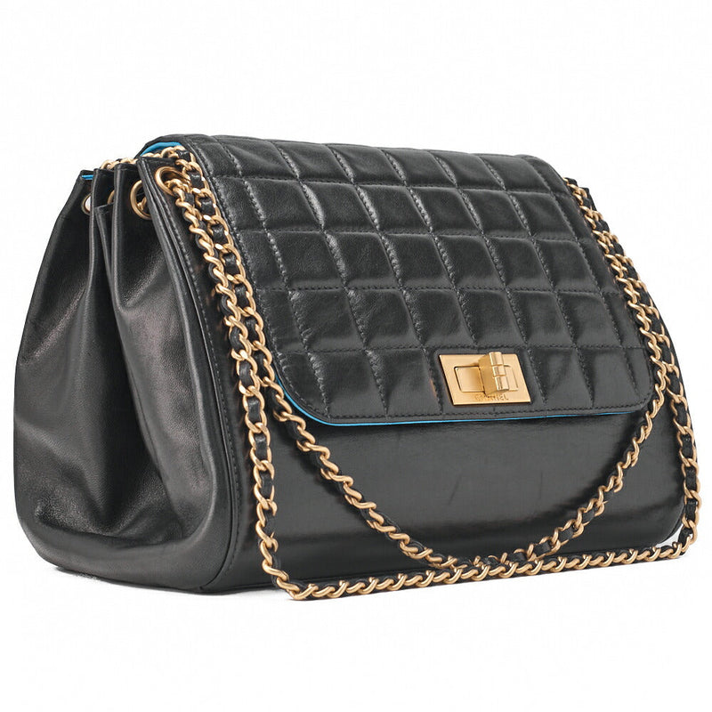 Sac à bandoulière en cuir d'agneau noir et bleu, d'occasion, avec chaîne et fermoir de 2,55 po, avec quincaillerie dorée.
