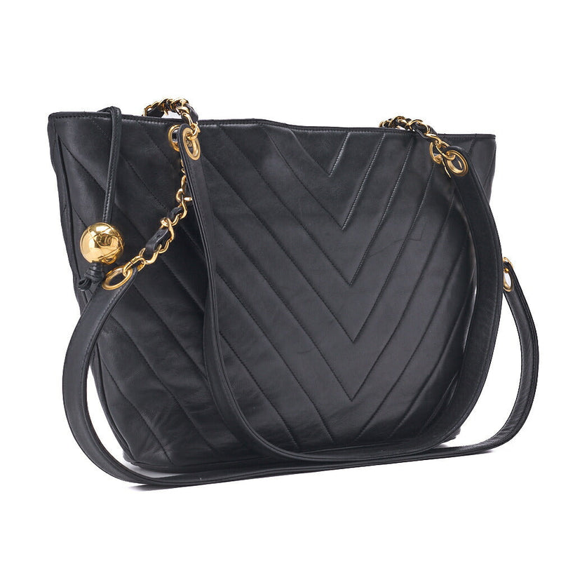 Sac bandoulière d'occasion, breloque boule à point V, bandoulière chaîne, cuir d'agneau, noir, finitions dorées, d'occasion