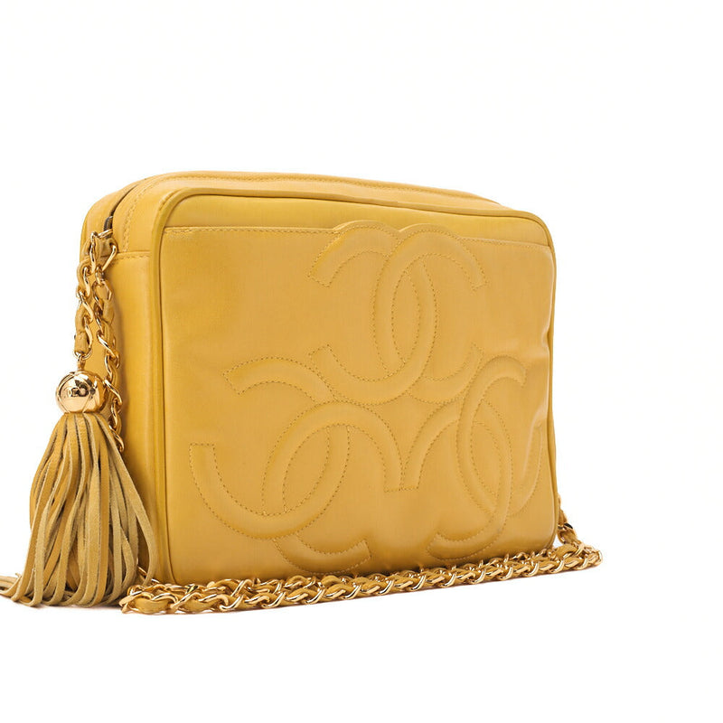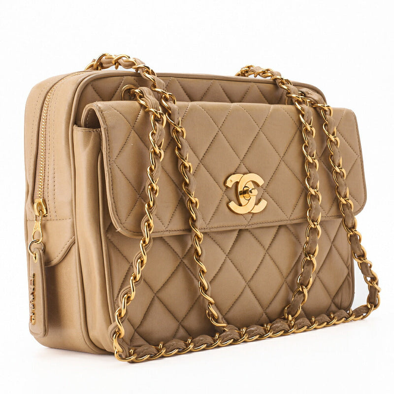 Sac bandoulière chaîne d'occasion en cuir d'agneau matelassé beige et accessoires dorés.