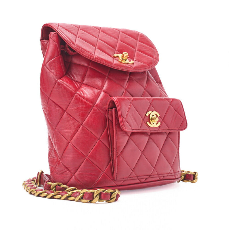 Sac à dos d'occasion en cuir d'agneau matelassé, rabat extérieur, fermoir pivotant, quincaillerie dorée rouge.