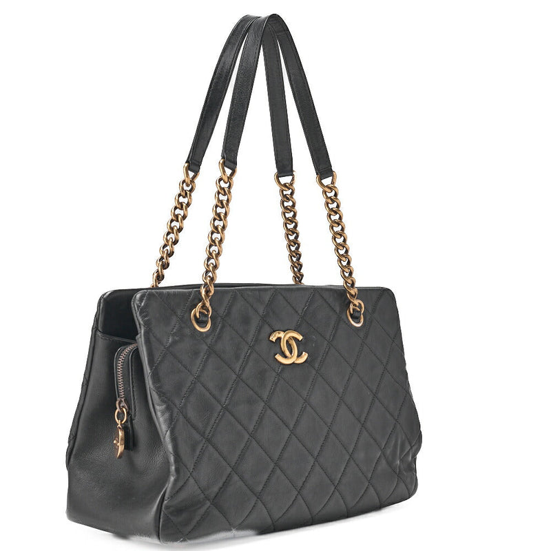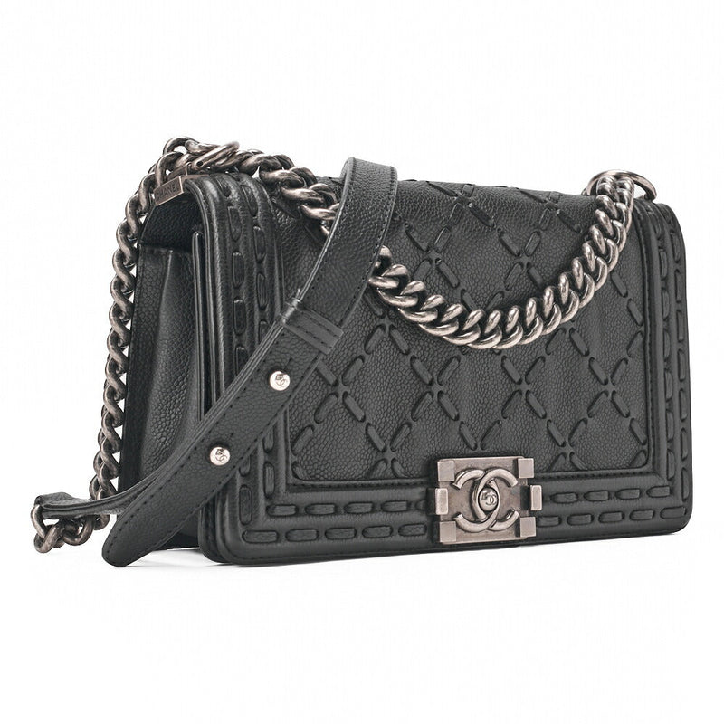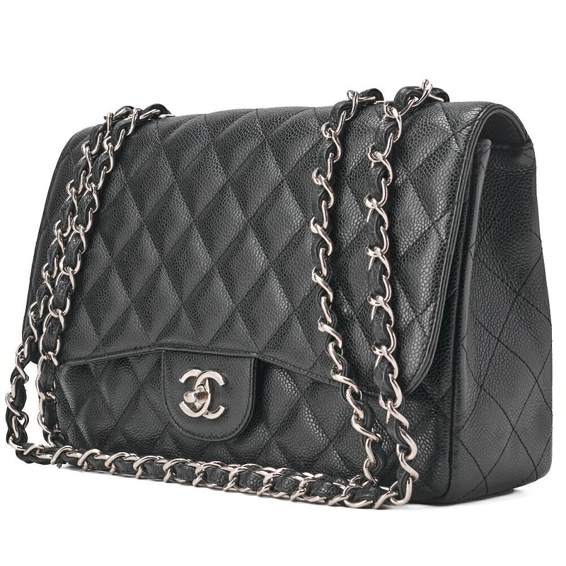 Sac à bandoulière chaîne d'occasion grand matelassé en cuir caviar noir et métal argenté