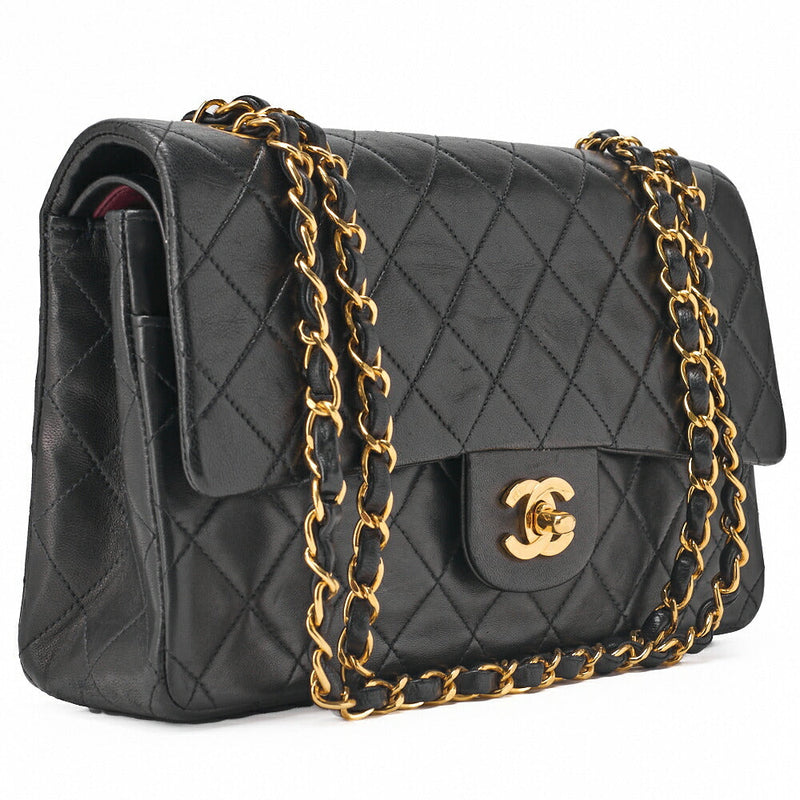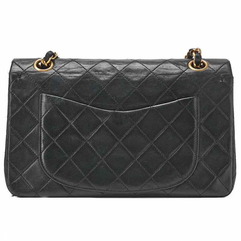 Sac bandoulière d'occasion Matelasse 23, double rabat, chaîne, cuir d'agneau noir, accessoires dorés.