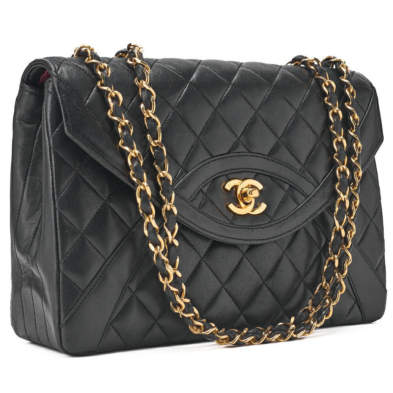 Sac à bandoulière matelassé d'occasion, double rabat, chaîne, cuir d'agneau noir, accessoires dorés.