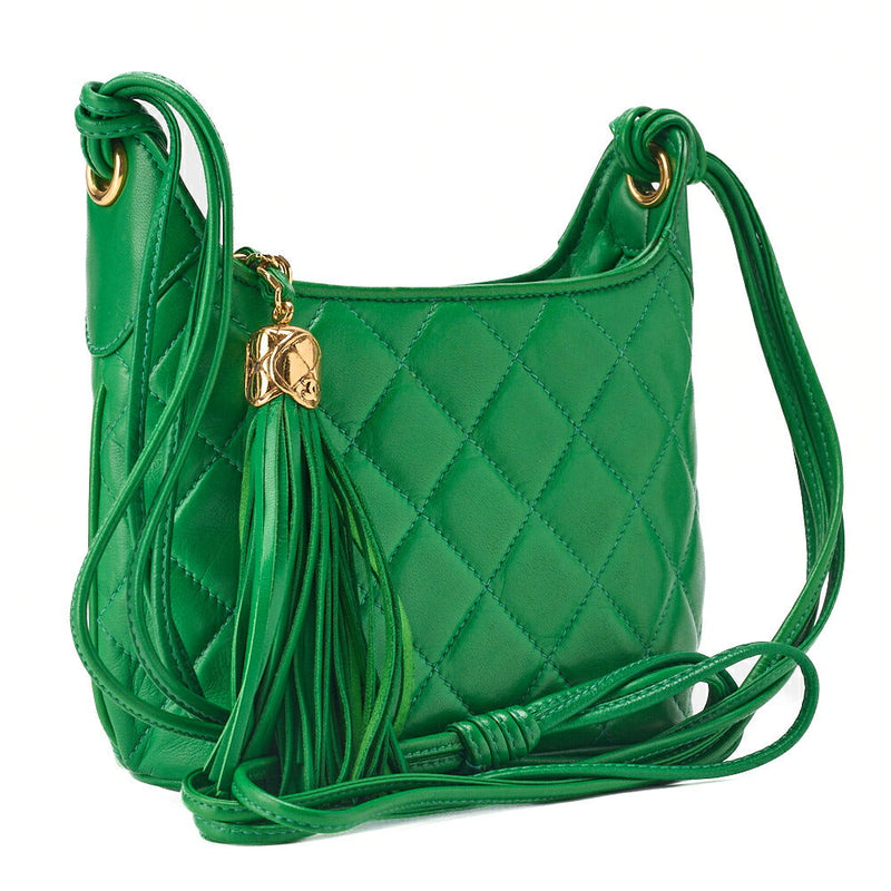 Sac bandoulière d'occasion, matelassé à franges, cuir d'agneau, vert, finitions dorées, d'occasion