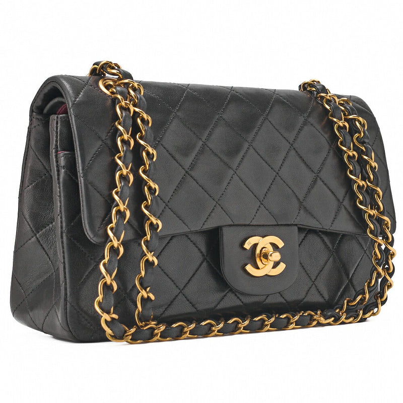 Sac bandoulière chaîne matelassé à double rabat en cuir d'agneau noir et métal doré d'occasion