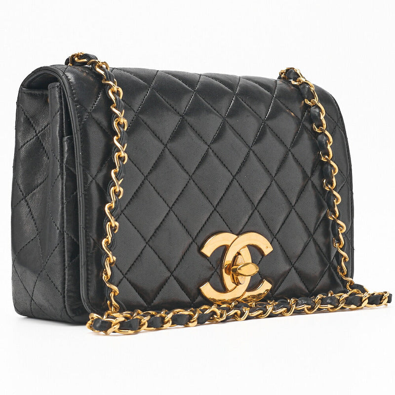 Sac bandoulière d'occasion en cuir d'agneau matelassé noir et métal doré.