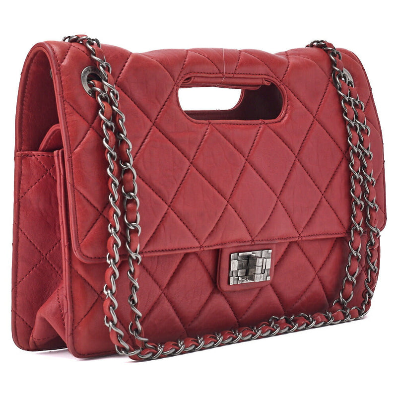 Sac à bandoulière matelassé d'occasion, fermoir tournant 2,55, chaîne en cuir d'agneau rouge, quincaillerie argentée. D'occasion