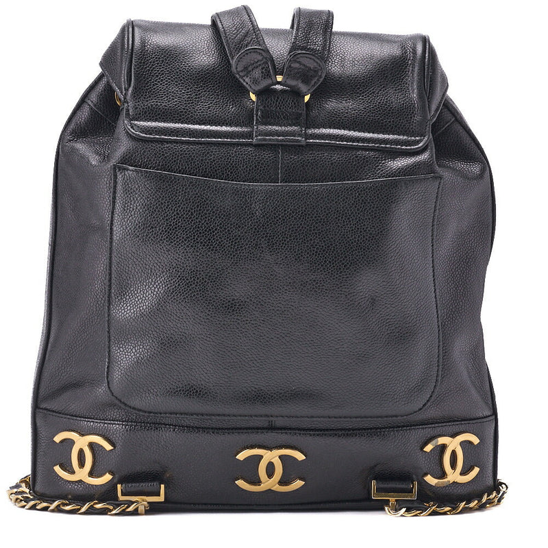 Sac à dos à bandoulière Triple Coco d'occasion, fermoir tournant, cuir d'agneau noir, quincaillerie dorée.