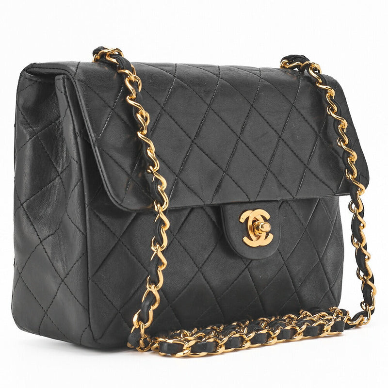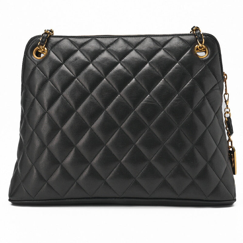 Sac à bandoulière Chanel d'occasion en cuir d'agneau matelassé noir et métal doré.
