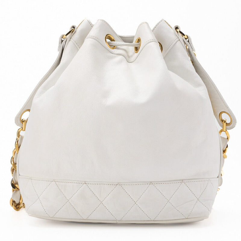 Sac à bandoulière Coco d'occasion en cuir d'agneau blanc avec cordon de serrage et finitions dorées.