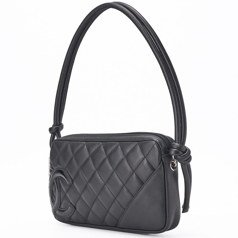Sac bandoulière d'occasion, ligne Cambon, matelassé, cuir de veau, noir, finitions dorées, d'occasion