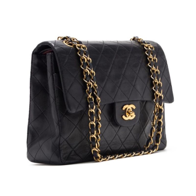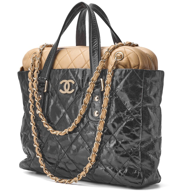 Sac fourre-tout matelassé d'occasion, bandoulière chaîne, cuir d'agneau noir, matériel doré.