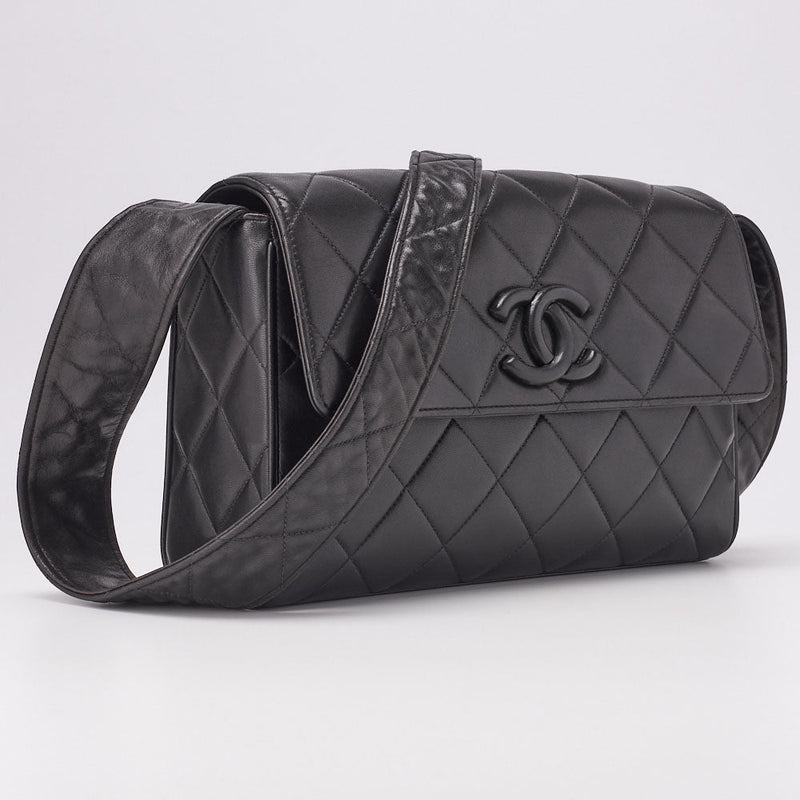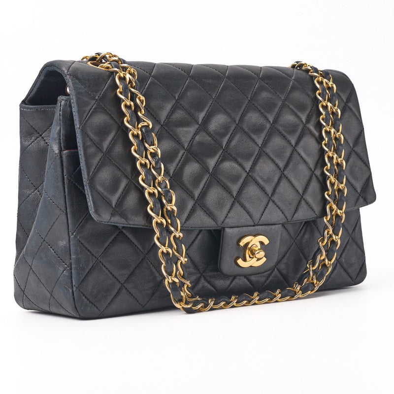 Sac à bandoulière matelassé d'occasion, double rabat, bandoulière chaîne, cuir d'agneau noir, accessoires dorés.