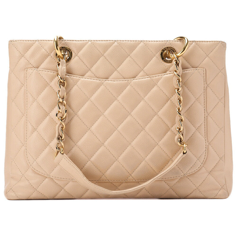 Sac fourre-tout à bandoulière matelassé d'occasion en cuir caviar beige et matériel argenté.