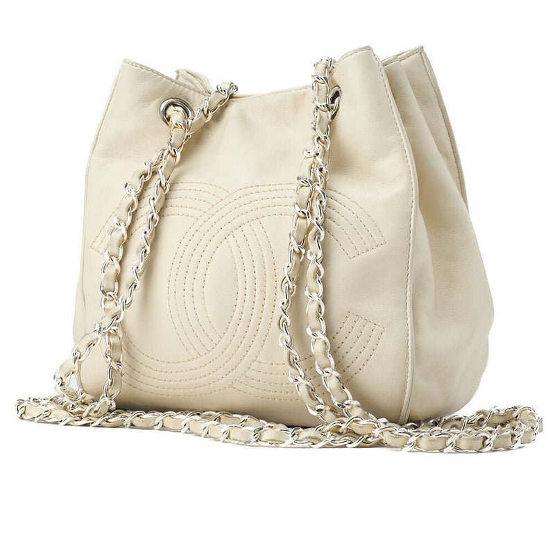 Sac fourre-tout à bandoulière d'occasion Coco Mark en cuir d'agneau ivoire et matériel argenté. D'occasion