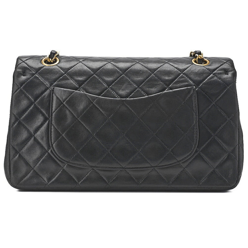Sac bandoulière chaîne matelassé à double rabat en cuir d'agneau noir et métal doré d'occasion