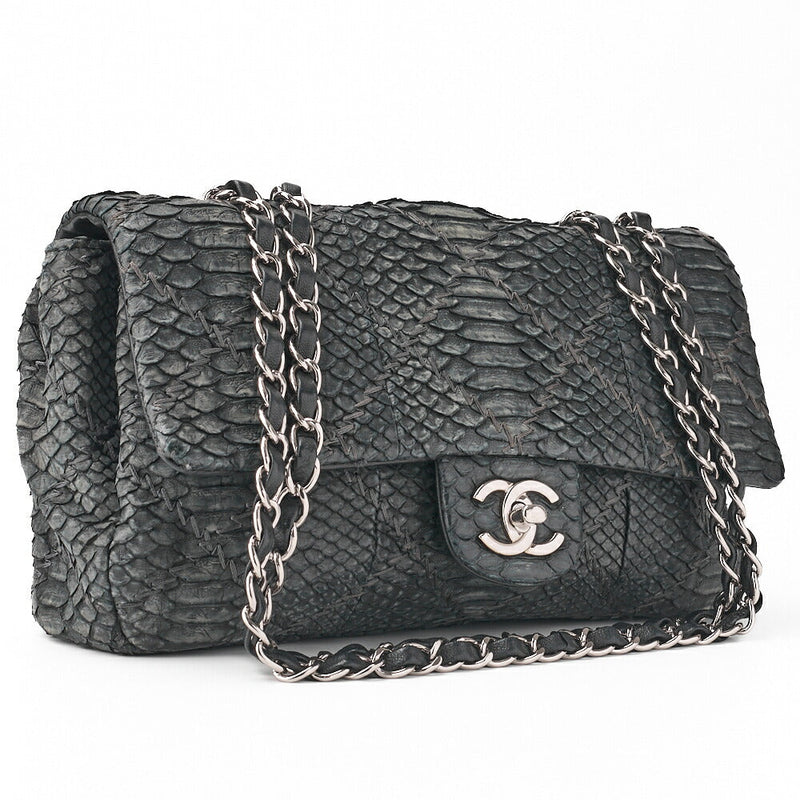 Sac bandoulière d'occasion, Matelasse, chaîne et fermoir tournant, python, noir, finitions dorées, d'occasion